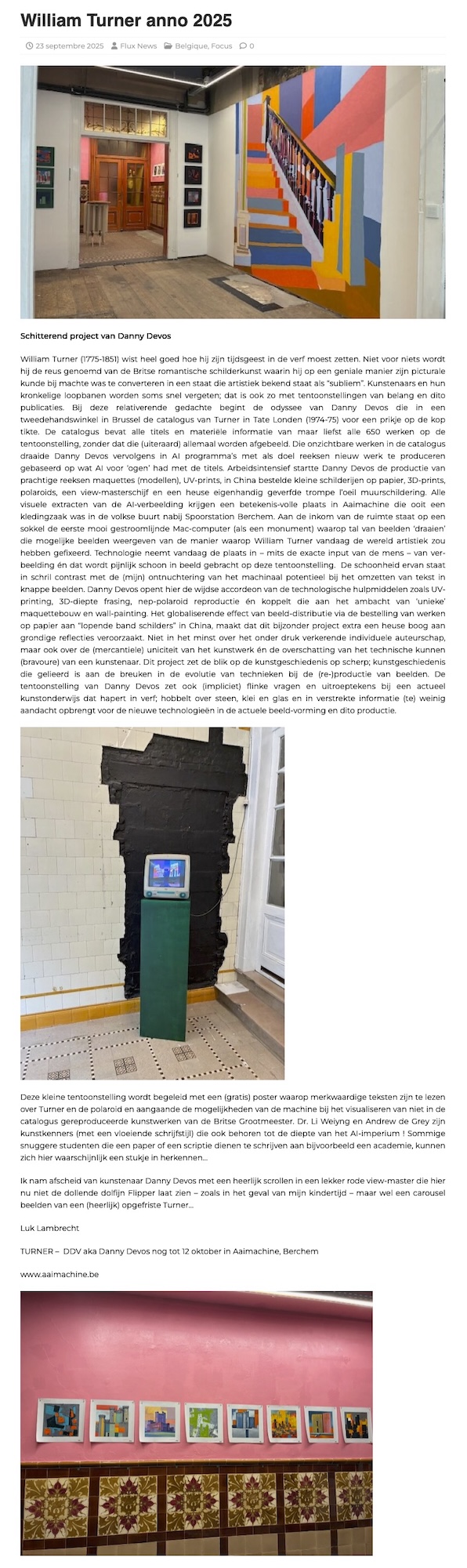 Schitterend project van Danny Devos William Turner (1775-1851) wist heel goed hoe hij zijn tijdsgeest in de verf moest zetten. Niet voor niets wordt hij de reus genoemd van de Britse romantische schilderkunst waarin hij op een geniale manier zijn picturale kunde bij machte was te converteren in een staat die artistiek bekend staat als “subliem”. Kunstenaars en hun kronkelige loopbanen worden soms snel vergeten; dat is ook zo met tentoonstellingen van belang en dito publicaties. Bij deze relativerende gedachte begint de odyssee van Danny Devos die in een tweedehandswinkel in Brussel de catalogus van Turner in Tate Londen (1974-75) voor een prikje op de kop tikte. De catalogus bevat alle titels en materiële informatie van maar liefst alle 650 werken op de tentoonstelling, zonder dat die (uiteraard) allemaal worden afgebeeld. Die onzichtbare werken in de catalogus draaide Danny Devos vervolgens in AI programma’s met als doel reeksen nieuw werk te produceren gebaseerd op wat AI voor ‘ogen’ had met de titels. Arbeidsintensief startte Danny Devos de productie van prachtige reeksen maquettes (modellen), UV-prints, in China bestelde kleine schilderijen op papier, 3D-prints, polaroids, een view-masterschijf en een heuse eigenhandig geverfde trompe l’oeil muurschildering. Alle visuele extracten van de AI-verbeelding krijgen een betekenis-volle plaats in Aaimachine die ooit een kledingzaak was in de volkse buurt nabij Spoorstation Berchem. Aan de inkom van de ruimte staat op een sokkel de eerste mooi gestroomlijnde Mac-computer (als een monument) waarop tal van beelden ‘draaien’ die mogelijke beelden weergeven van de manier waarop William Turner vandaag de wereld artistiek zou hebben gefixeerd. Technologie neemt vandaag de plaats in – mits de exacte input van de mens – van ver-beelding én dat wordt pijnlijk schoon in beeld gebracht op deze tentoonstelling. De schoonheid ervan staat in schril contrast met de (mijn) ontnuchtering van het machinaal potentieel bij het omzetten van tekst in knappe beelden. Danny Devos opent hier de wijdse accordeon van de technologische hulpmiddelen zoals UV-printing, 3D-diepte frasing, nep-polaroid reproductie én koppelt die aan het ambacht van ‘unieke’ maquettebouw en wall-painting. Het globaliserende effect van beeld-distributie via de bestelling van werken op papier aan “lopende band schilders” in China, maakt dat dit bijzonder project extra een heuse boog aan grondige reflecties veroorzaakt. Niet in het minst over het onder druk verkerende individuele auteurschap, maar ook over de (mercantiele) uniciteit van het kunstwerk én de overschatting van het technische kunnen (bravoure) van een kunstenaar. Dit project zet de blik op de kunstgeschiedenis op scherp; kunstgeschiedenis die gelieerd is aan de breuken in de evolutie van technieken bij de (re-)productie van beelden. De tentoonstelling van Danny Devos zet ook (impliciet) flinke vragen en uitroeptekens bij een actueel kunstonderwijs dat hapert in verf; hobbelt over steen, klei en glas en in verstrekte informatie (te) weinig aandacht opbrengt voor de nieuwe technologieën in de actuele beeld-vorming en dito productie. Deze kleine tentoonstelling wordt begeleid met een (gratis) poster waarop merkwaardige teksten zijn te lezen over Turner en de polaroid en aangaande de mogelijkheden van de machine bij het visualiseren van niet in de catalogus gereproduceerde kunstwerken van de Britse Grootmeester. Dr. Li Weiyng en Andrew de Grey zijn kunstkenners (met een vloeiende schrijfstijl) die ook behoren tot de diepte van het AI-imperium ! Sommige snuggere studenten die een paper of een scriptie dienen te schrijven aan bijvoorbeeld een academie, kunnen zich hier waarschijnlijk een stukje in herkennen… Ik nam afscheid van kunstenaar Danny Devos met een heerlijk scrollen in een lekker rode view-master die hier nu niet de dollende dolfijn Flipper laat zien – zoals in het geval van mijn kindertijd – maar wel een carousel beelden van een (heerlijk) opgefriste Turner… Luk Lambrecht TURNER – DDV aka Danny Devos nog tot 12 oktober in Aaimachine, Berchem ==================================================================== A magnificent project by Danny Devos William Turner (1775-1851) knew very well how to capture the spirit of his time. It is not without reason that he is called the giant of British Romantic painting, in which he was able to convert his pictorial skills in a brilliant way into a state known artistically as “sublime”. Artists and their winding careers are sometimes quickly forgotten, as are important exhibitions and publications. This thought puts things into perspective and marks the beginning of Danny Devos' odyssey, who picked up the catalogue of Turner at Tate London (1974-75) for a song in a second-hand shop in Brussels. The catalogue contains all the titles and material information of no fewer than 650 works in the exhibition, without (of course) depicting them all. Danny Devos then ran these invisible works in the catalogue through AI programmes with the aim of producing series of new work based on what AI “saw” in the titles. Danny Devos laboriously began producing a series of beautiful maquettes (models), UV prints, small paintings on paper ordered from China, 3D prints, Polaroids, a view master disc and a genuine hand-painted trompe l'oeil mural. All visual extracts from the AI imagination are given a meaningful place in Aaimachine, which was once a clothing store in the working-class neighbourhood near Berchem railway station. At the entrance to the space, the first beautifully streamlined Mac computer stands on a pedestal (like a monument), displaying numerous images that represent how William Turner might have artistically captured the world today. Technology now takes the place – provided with the exact input from humans – of imagination, and this is painfully clear in this exhibition. Its beauty stands in stark contrast to (my) disillusionment with the 