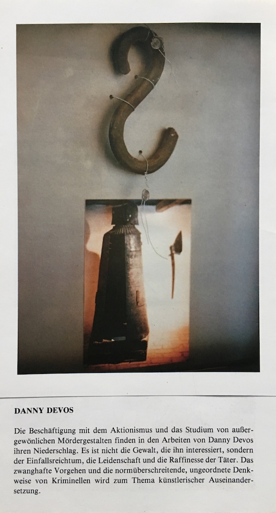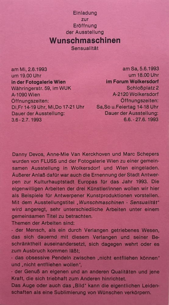 Danny Devos, Anne-Mie Van Kerckhoven und Marc Schepers wurden von FLUSS und der Fotogalerie Wien zu einer gemeinsamen Ausstellung in Wolkersdorf und Wien eingeladen. Äußerer Anlaß dafür war auch die Ernennung der Stadt Antwerpen zur Kulturhauptstadt Europas für das Jahr 1993. Die eigenwilligen Arbeiten der drei Künstler/innen wollen wir hier als Beispiele für Antwerpener Kunstproduktionen vorstellen. Mit dem Ausstellungstitel „Wunschmaschinen - Sensualität" wird angeregt, sehr unterschiedliche Arbeiten unter einem gemeinsamen Titel zu betrachten. Themen der Arbeiten sind: - der Mensch, als ein durch Verlangen getriebenes Wesen, das sich dauernd mit diesem Verlangen und seiner Beschränktheit auseinandersetzt, sich dagegen wehrt oder es zum Ausbruch kommen läßt; - das obsessive Pendeln zwischen „nicht entfliehen können" und „nicht entfliehen wollen" - der Genuß an eigenen und an anderen Qualitäten und jene Kraft, die sich triebhaft zum Anderen hinrichtet. Das Auge oder auch das „Bild" kann die eigentlichen Leidenschaften als eine Sublimierung von Wünschen verkörpern. | ||
