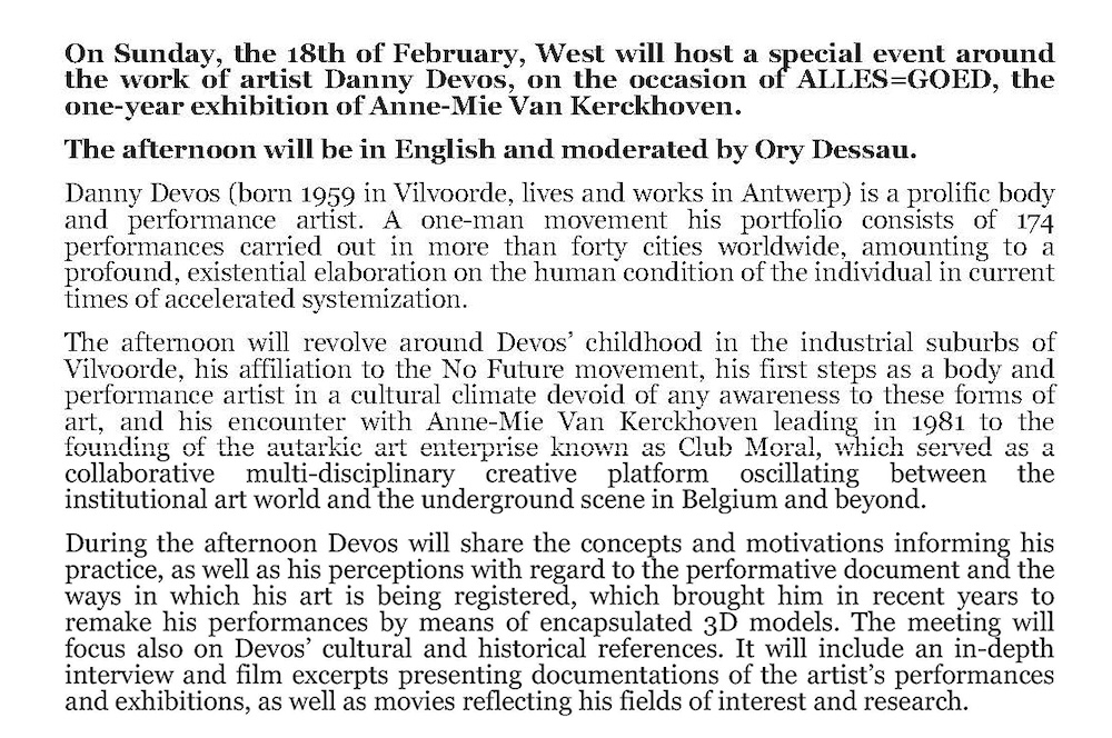 On Sunday, the 18th of February, West will host a special event around the work of artist Danny Devos, on the occasion of ALLES=GOED, the one-year exhibition of Anne-Mie Van Kerckhoven. The afternoon will be in English and moderated by Ory Dessau. Danny Devos (born 1959 in Vilvoorde, lives and works in Antwerp) is a prolific body and performance artist. A one-man movement his portfolio consists of 174 performances carried out in more than forty cities worldwide, amounting to a profound, existential elaboration on the human condition of the individual in current times of accelerated systemization. The afternoon will revolve around Devos’ childhood in the industrial suburbs of Vilvoorde, his affiliation to the No Future movement, his first steps as a body and performance artist in a cultural climate devoid of any awareness to these forms of art, and his encounter with Anne-Mie Van Kerckhoven leading in 1981 to the founding of the autarkic art enterprise known as Club Moral, which served as a collaborative multi-disciplinary creative platform oscillating between the institutional art world and the underground scene in Belgium and beyond. During the afternoon Devos will share the concepts and motivations informing his practice, as well as his perceptions with regard to the performative document and the ways in which his art is being registered, which brought him in recent years to remake his performances by means of encapsulated 3D models. The meeting will focus also on Devos’ cultural and historical references. It will include an in-depth interview and film excerpts presenting documentations of the artist’s performances and exhibitions, as well as movies reflecting his fields of interest and research. Op zondag 18 februari organiseert West een speciaal evenement rond het werk van kunstenaar Danny Devos, naar aanleiding van ALLES=GOED, de eenjarige tentoonstelling van Anne-Mie Van Kerckhoven. De namiddag is Engelstalig en wordt gemodereerd door Ory Dessau. Danny Devos is geboren in 1959 in Vilvoorde en woont en werkt in Antwerpen. Devos is een body- en performancekunstenaar met een omvangrijk oeuvre. Zijn portfolio bestaat uit 174 performances uitgevoerd in meer dan veertig steden wereldwijd. Werk dat een diepgaande, existentiële uitwerking op de menselijke conditie van het individu in de huidige tijden van versnelde systematisering toont. De middag zal gaan over Devos' kindertijd in de industriële buitenwijken van Vilvoorde, zijn aansluiting bij de No Future beweging, zijn eerste stappen als performance-kunstenaar, en zijn ontmoeting met Anne-Mie Van Kerckhoven die in 1981 leidde tot de oprichting van de autarkische kunstenaarsinitiatief Club Moral, dat diende als een collaboratief multidisciplinair platform schommelend tussen de institutionele kunstwereld en de underground scene in België en daarbuiten. Tijdens deze middag zal Devos de concepten en beweegredenen van zijn praktijk met ons delen. Zijn perceptie op performances en de manieren waarop zijn kunst wordt geregistreerd. Hij zal in gaan op wat hem de afgelopen jaren ertoe bracht om zijn performances opnieuw te creëren door middel van 3D-modellen. De middag richt zich ook op Devos' culturele en historische achtergrond, met een diepte-interview en filmfragmenten van de performances en tentoonstellingen van de kunstenaar en films die zijn interessegebieden en onderzoek weerspiegelen. | ||
