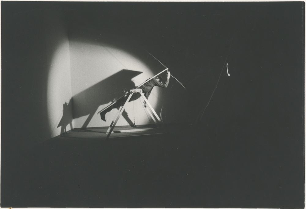 Ik lag vastgebonden op een tafel die ik op eigen kracht 360° kon laten ronddraaien. In de kamer ernaast waar het publiek zich bevond werden dia’s van industriële landschappen getoond. De deur tussen de twee kamers werd voortdurend geopend en weer dichtgegooid zodat telkens slechts enkele mensen een glimp van de performance konden opvangen. Als de deur dicht was kon je luide monotone muziek horen als ze open was hoorde je niets. I was tied to a table which I could turn over 360° by my own power. In the room next door where the public was slides of industrial landscapes were shown. The door between the two rooms was continuously opened and slammed back so only a few people could have a glance at the performance inside each time. When the door was closed you could hear loud monotone music when it was open you didn’t hear anything. | ||