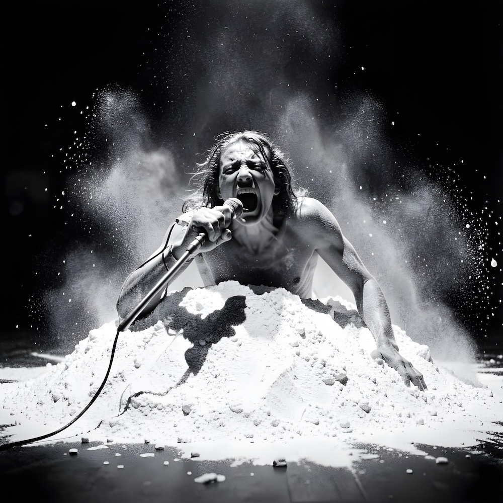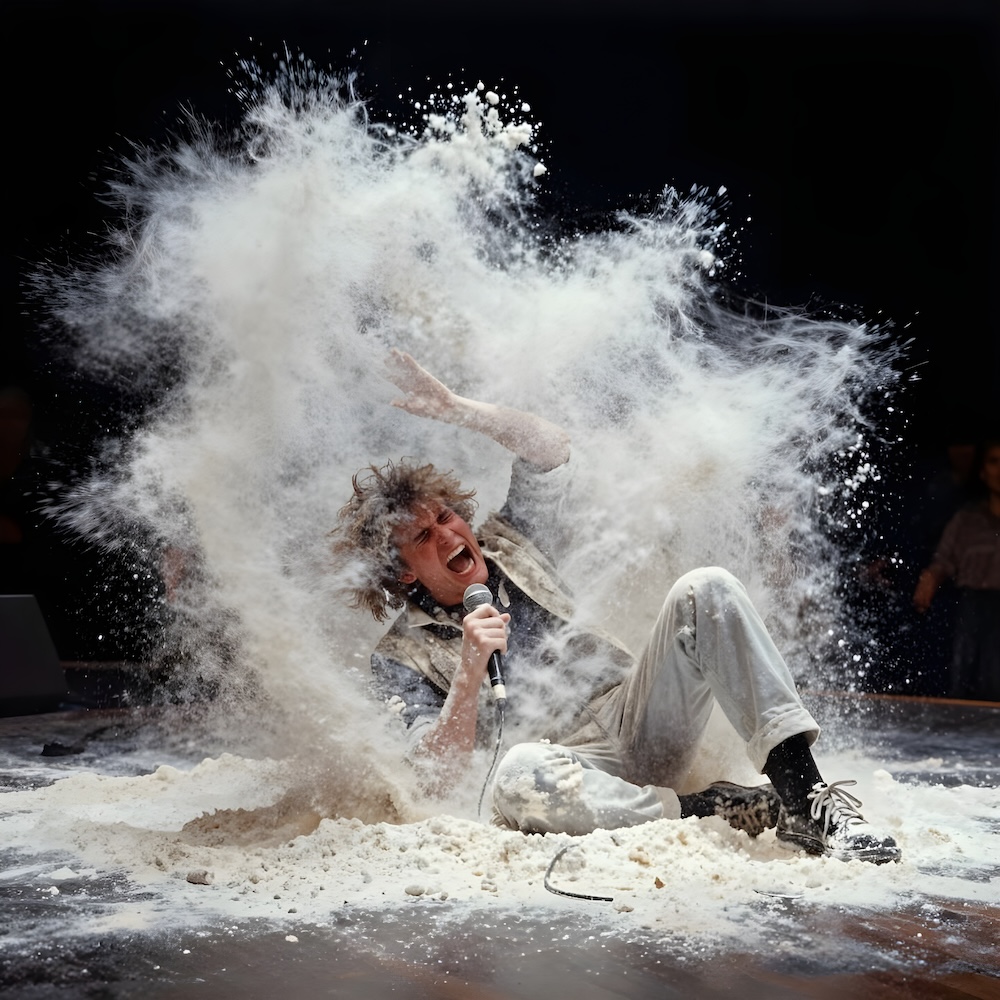 Performance art - 13 January 1980 - During a concert by the band ‘Happy Star/Nominette’ I rolled violently through a heap of flour and screamed as loud as I could in a microphone until I was exhausted.