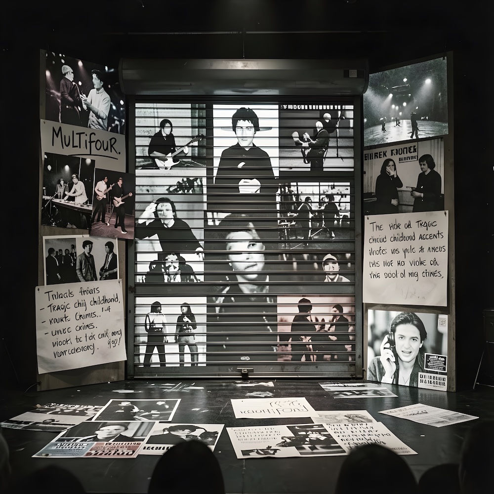 Performance art - 16 February 1980 - ‘Multifour’ played films and tapes of concerts newsitems films and phone-calls. We read texts about accidents with children and sex-murders. We threw an iron rolling shutter before the stage up and down the whole time. After half an hour we were thrown out.