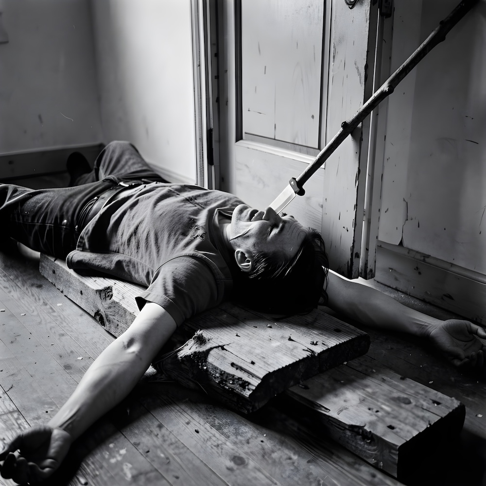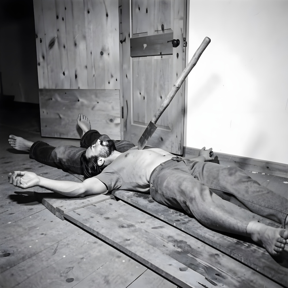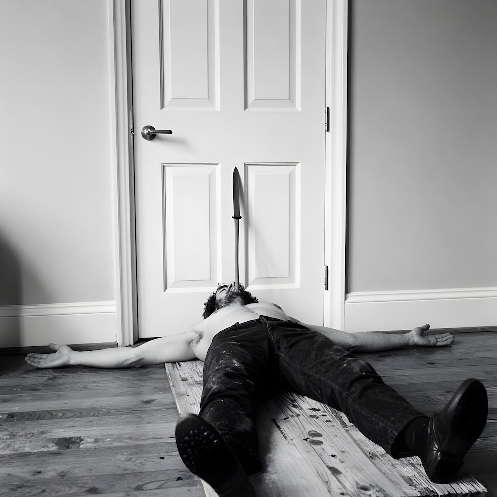 Performance art - 18 June 1980 - I was laying on a piece of wood with my arms spread. Between my throat and the door a stick with a sharp knife was jammed.