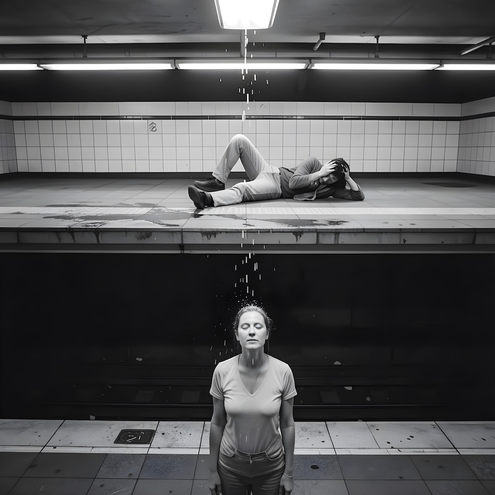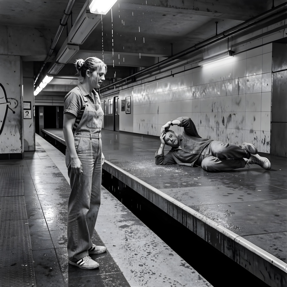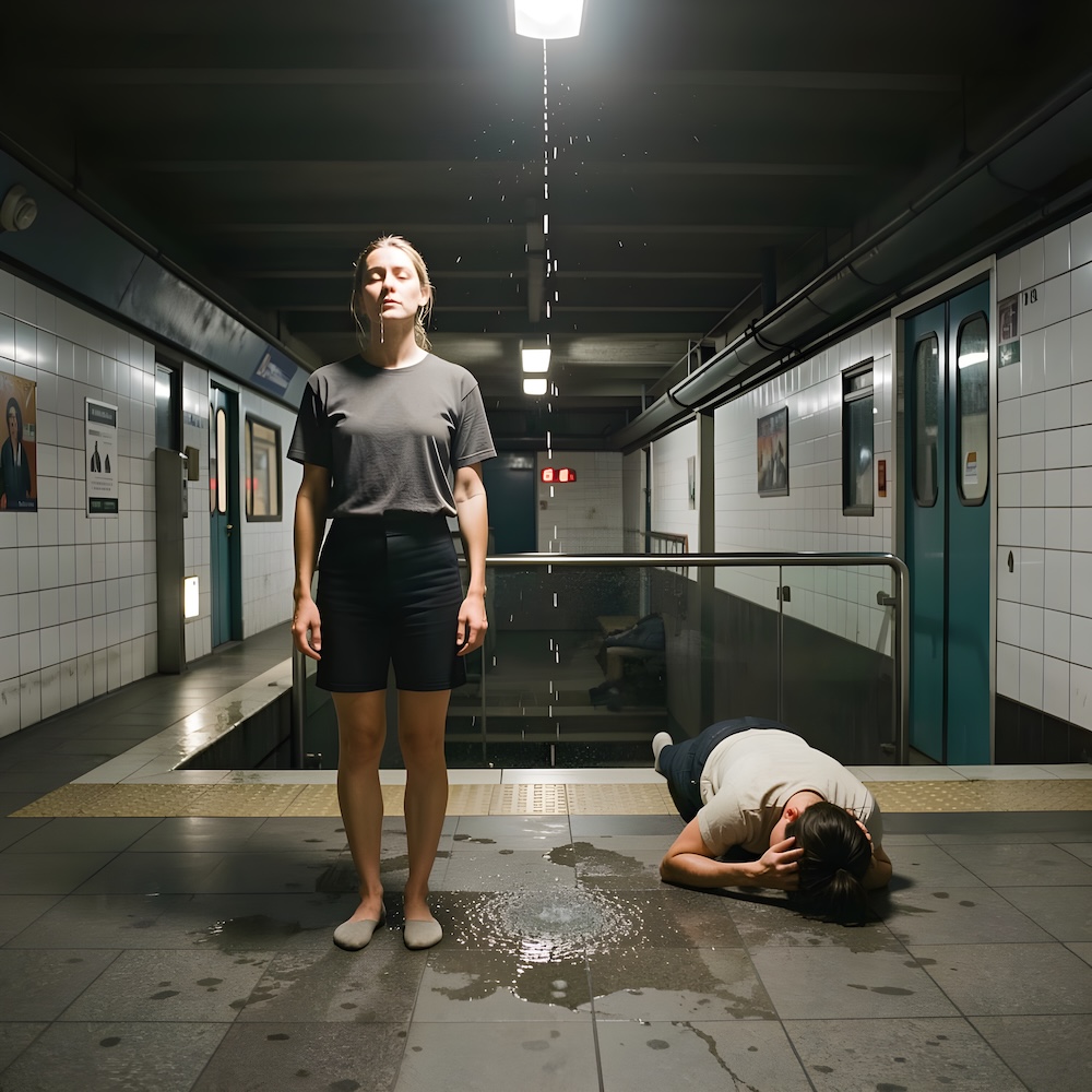 Performance art - 28 June 1980 - Ria PacquƩe stood on the lower metro-platform. A drop of water was falling on her head continuously. I was laying on the floor on the upper platform and hit the floor with my forehead. I imagined the rhythm of the falling drop. The performance lasted three hours.