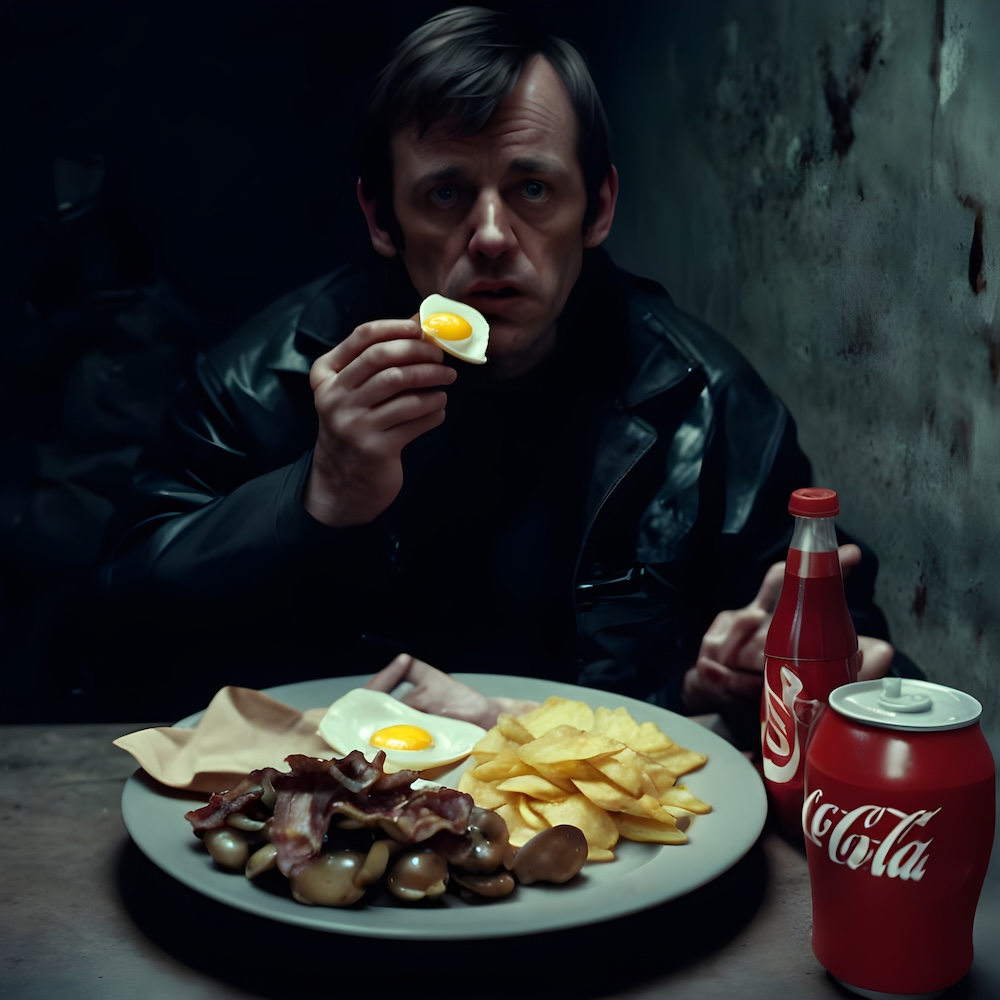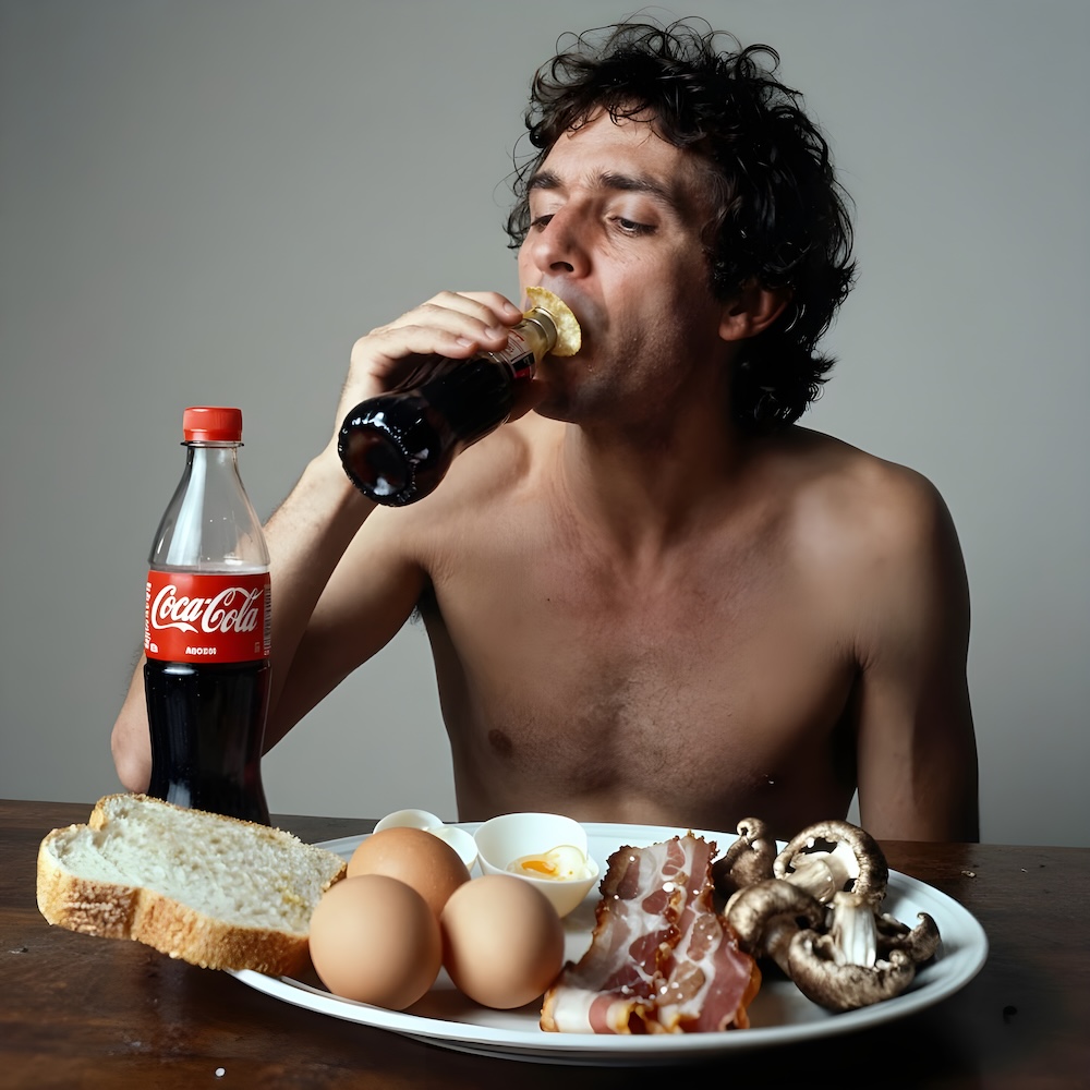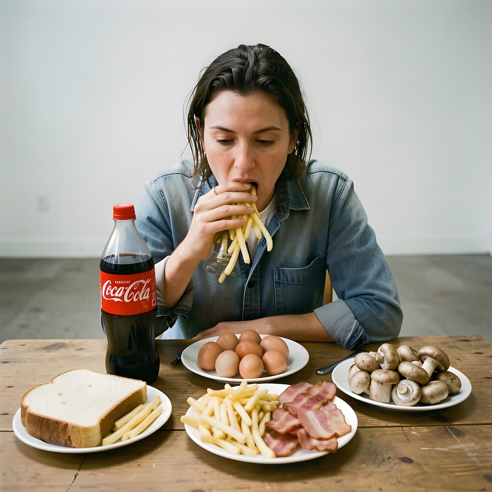 Performance art - 4 August 1980 - For 11 days I lived on 250 grams of chips and 1 liter Coca-Cola a day. The next day I ate half a bread 6 eggs 6 slices of bacon and 250 grams of mushrooms.