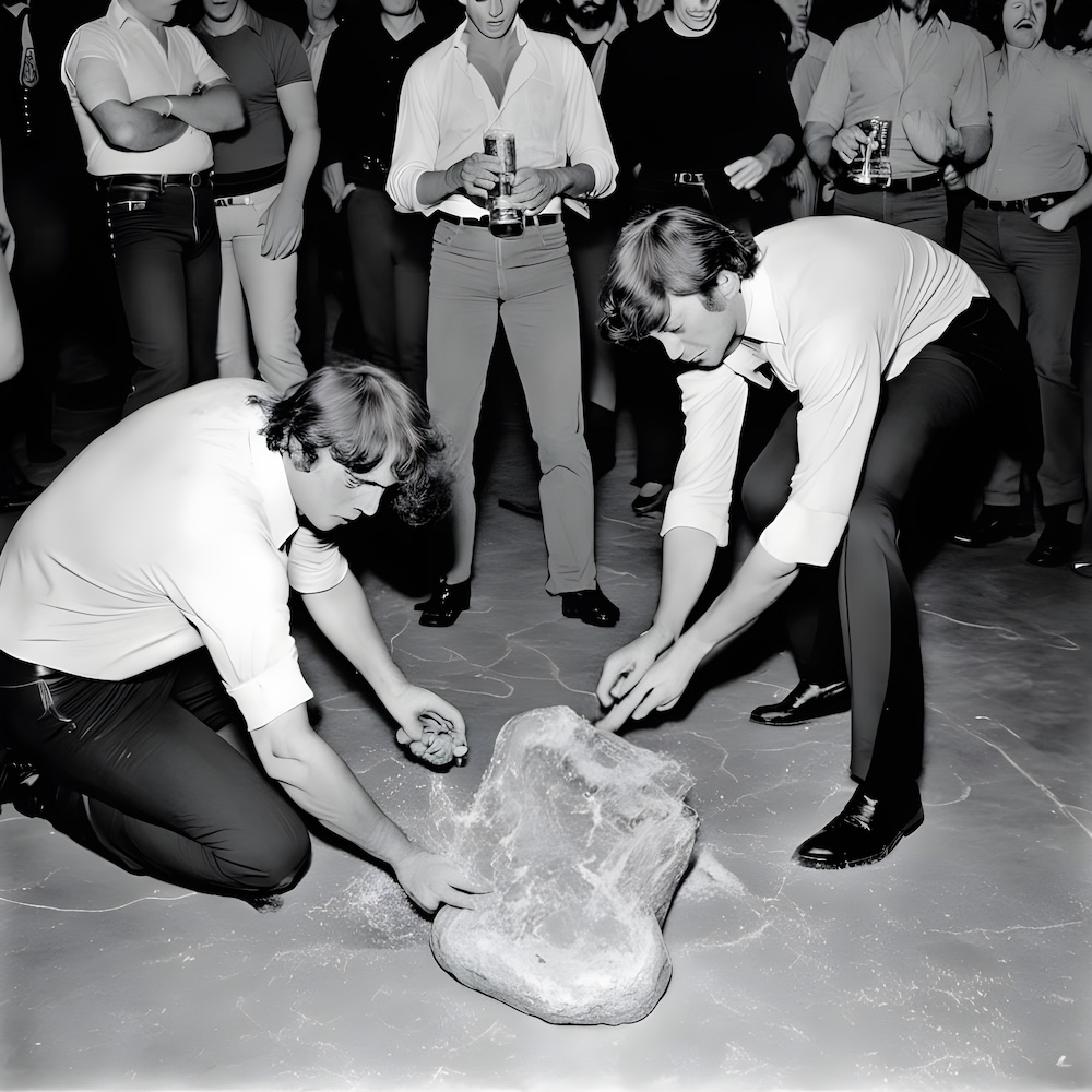 Performance art - 27 September 1980 - While the Simpletones played their music fast I pulled a heavy stone across the floor drawing an eternity-sign. After 20 minutes someone threw a glass of beer over a power-supply and we were cut off.