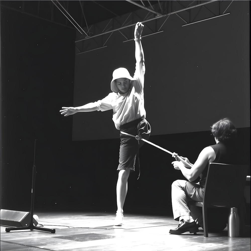Performance art - 3 April 1981 - During a concert by Etat Brut I was standing before a filmscreen and threw my right leg as high as I could several times. To my left foot a rope was fastened at which somebody pulled at a non-defined moment. I suffered a concussion of the brain.
