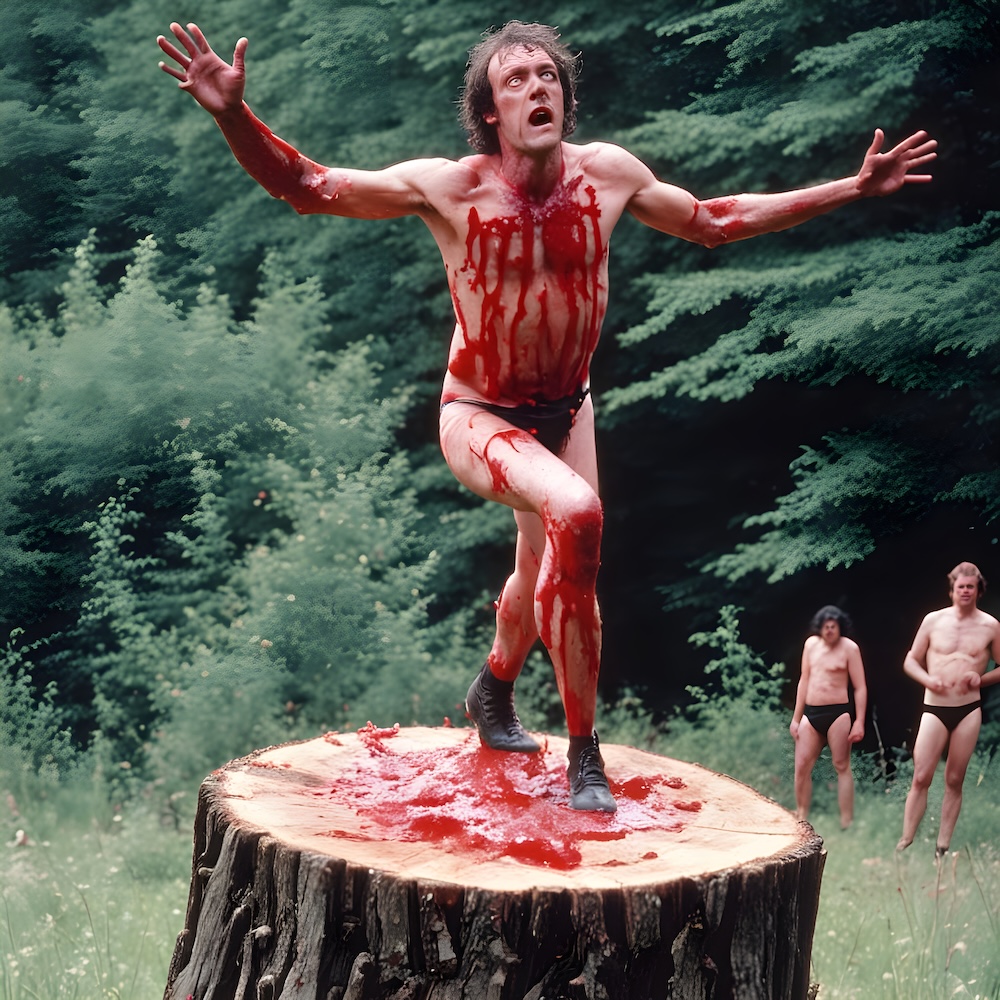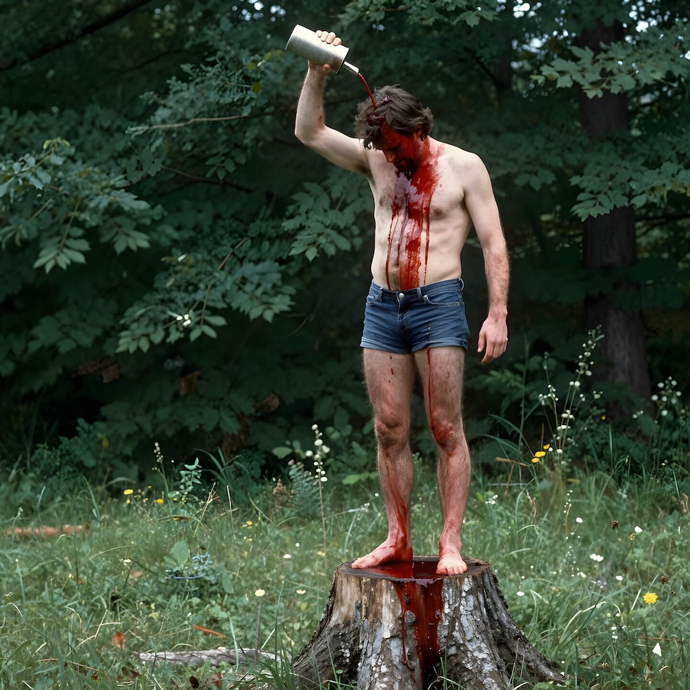 Performance art - 10 June 1983 - Standing on a tree stump I read confessions from multiple murderer and cannibal Karl Friedrich Großmann, then I poured blood over my head and let it run down over my body onto the tree stump. An AI image for my 'Karl Großmann' performance. The description above was the prompt for the generated image. An image generated by an AI Machine Learning Model Property of the artist. | ||