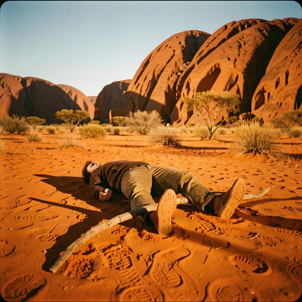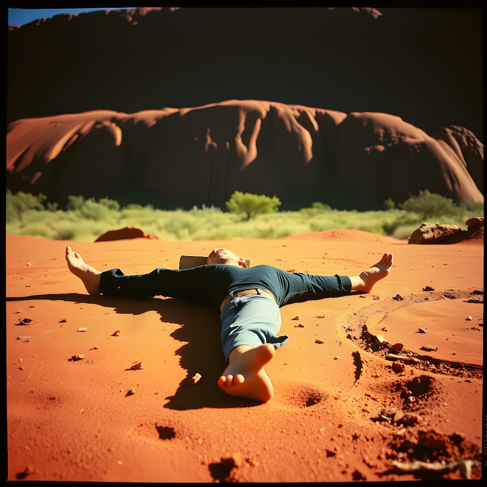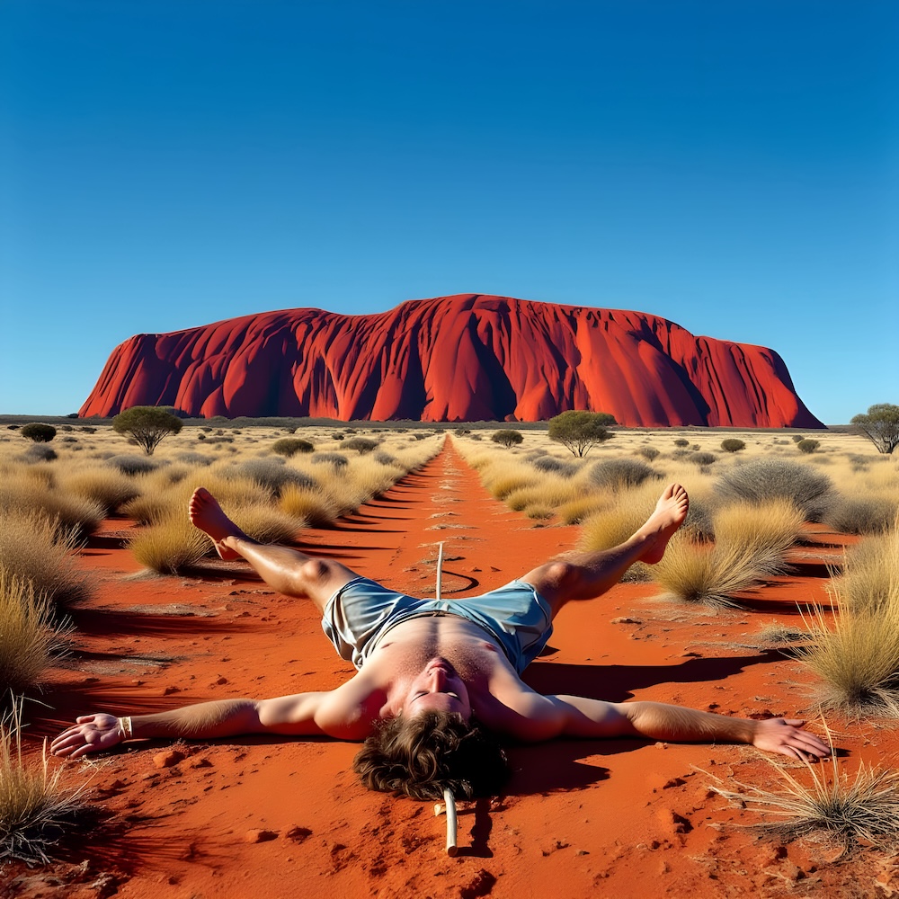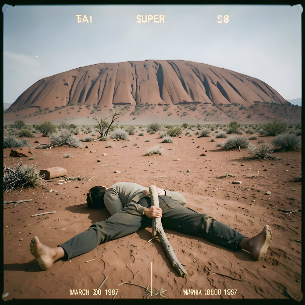 Performance art - 30 March 1987 - When visiting Uluru I asked Danny to lay down on his stomach with his legs open, a piece of wood between his ankles and his hands behind his back, near the so-called Kangaroo's Tail Men's Sacred Site. A secret performance to pay an homage to the time we met. I shot a three minute Super8 movie of the performance. Only the energy of the spot and the secrecy of the event defined my actions. An AI image for my 'L'Age d'Or - Uluru' performance. The description above was the prompt for the generated image. An image generated by an AI Machine Learning Model Property of the artist. | ||