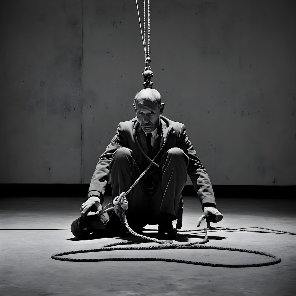 Performance art - 10 April 1987 - A variation on the L’Age d’Or performance where my feet were tied to the floor and I tried to pull myself off the ground via a pulley and a rope around my neck. Using a throat-microphone I repeated “I wanna be injured”, the sound was electronically distorted by AMVK. An AI image for my 'L'Age D'Or Nr 2 - Variation Belgicus' performance. The description above was the prompt for the generated image. An image generated by an AI Machine Learning Model Property of the artist. | ||