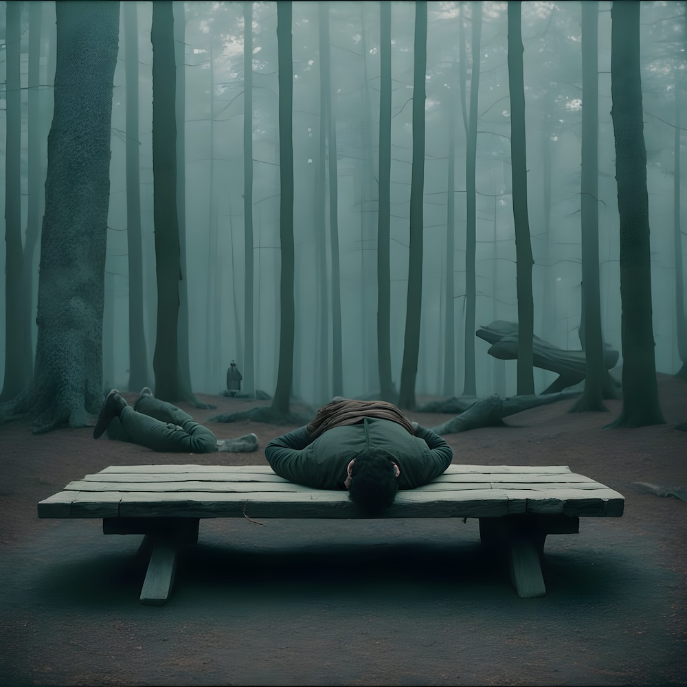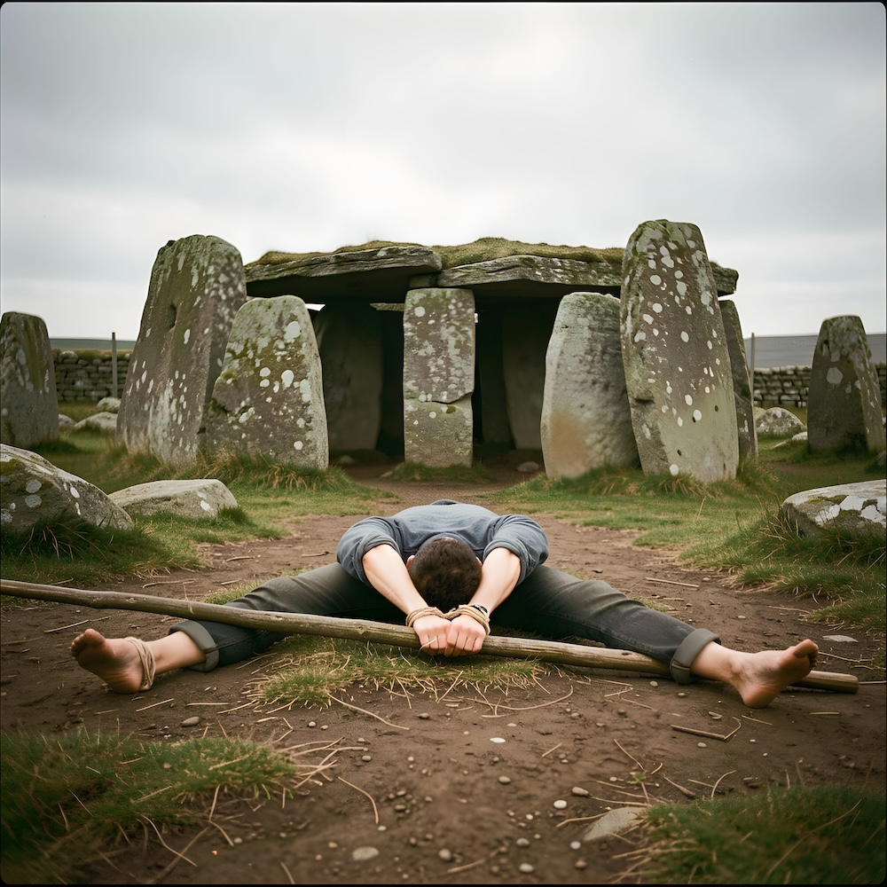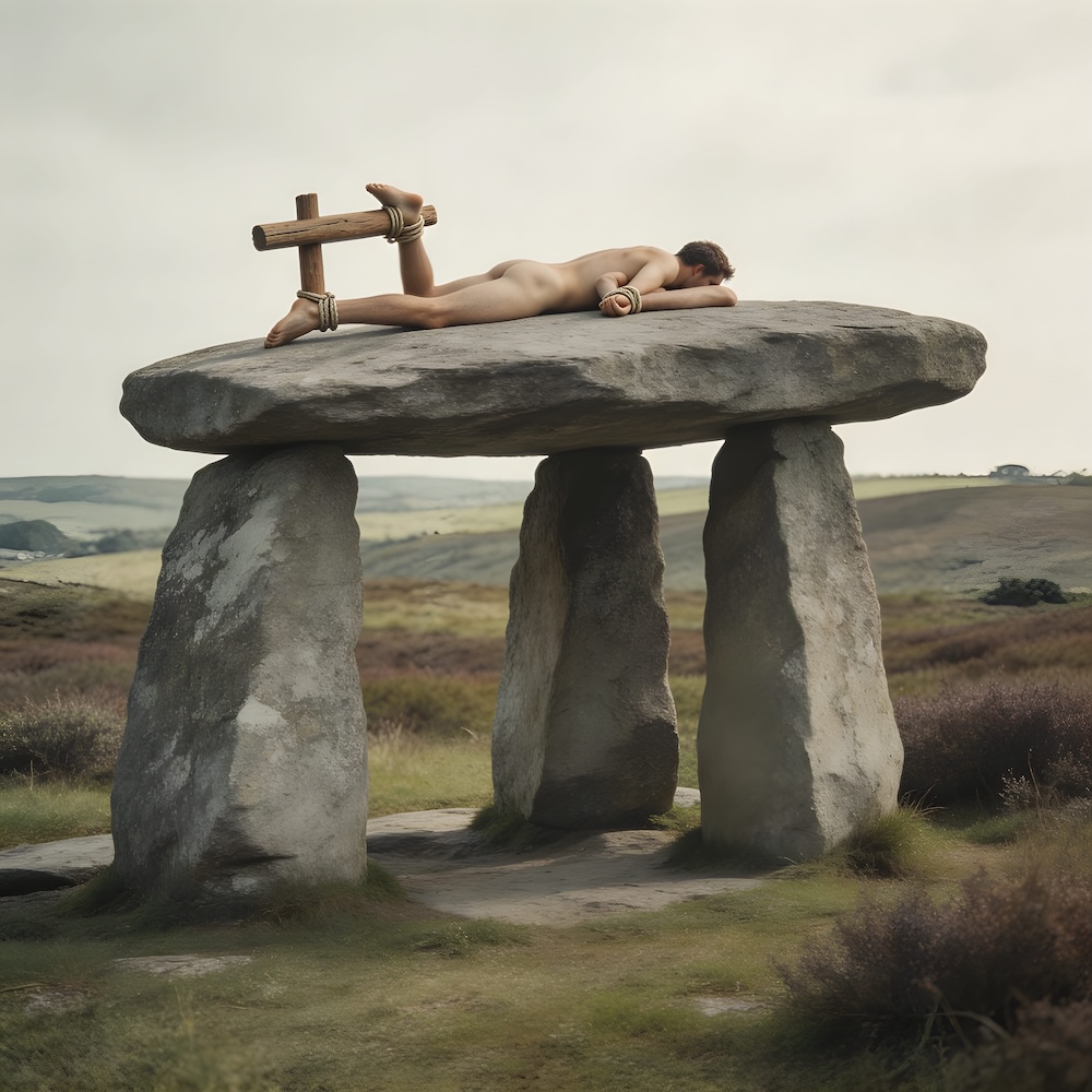 Performance art - August 1987 - When visiting a Dolmen in Brittany, France, I asked Danny to lay down naked on his stomach with his legs open, a piece of wood tied between his ankles, his hands tied behind his back. A secret performance to pay an homage to the time we met and when he did the performance "I Wanna be Injured" at the end of my exhibition "=Basic" in Art Something, Amsterdam. I shot a three minute Super8 movie of his performance, no editing afterwards. Only the energy of the spot and the secrecy of the event defined my actions. An AI image for my 'L'Age d'Or - Dolmen' performance. The description above was the prompt for the generated image. An image generated by an AI Machine Learning Model Property of the artist. | ||