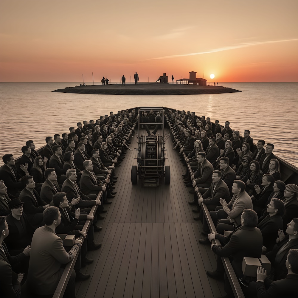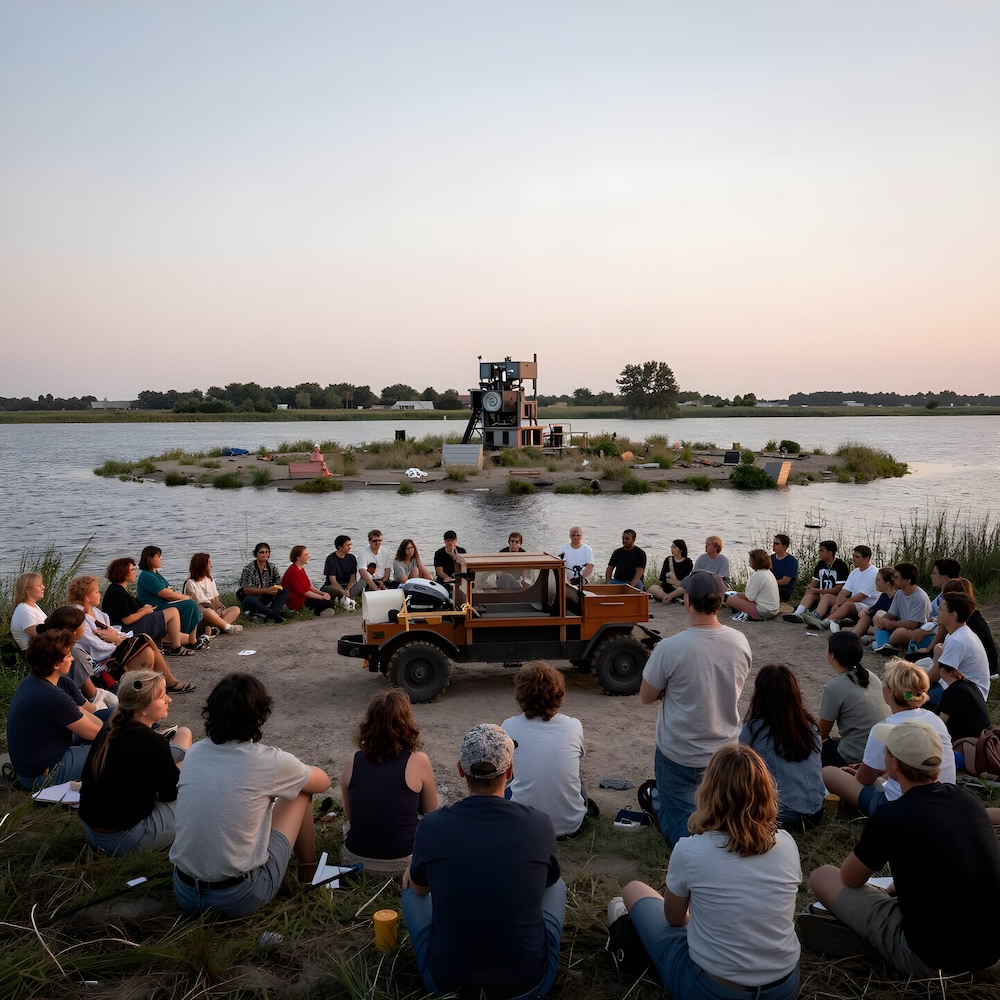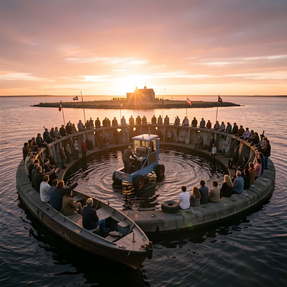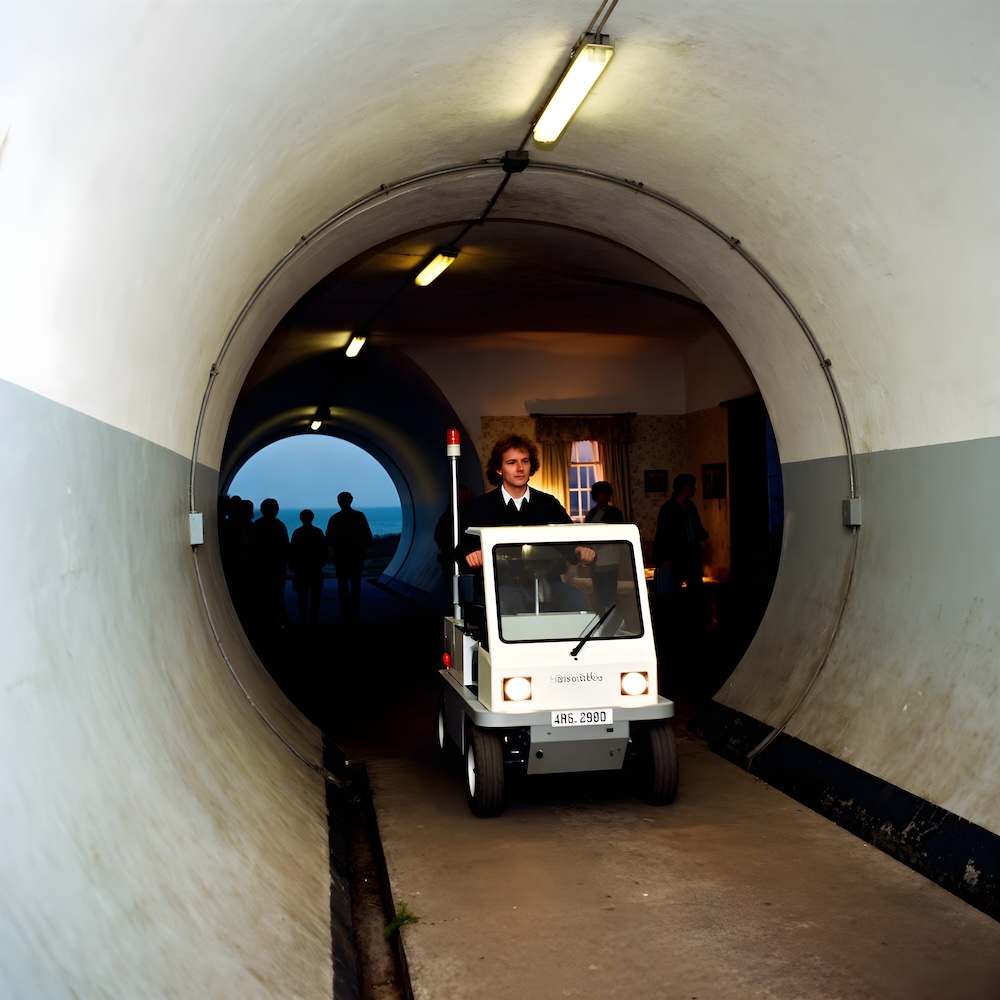 Performance art - 4 August 1989 - The audience was transported by boat to an unknown destination. It turned out to be a desolate artificial island - Fort Pampus - in the IJsselmeer which had been ‘annexated’ by artists. I made a machine that drove by itself through the circular corridor be reconstructed locations that remembered the ‘Manson Family’ and that adventurous visitors could follow. The - forced - stay on Pampus went from sunset till sunrise. An AI image for my 'Manson Memorial 1969-1989' performance. The description above was the prompt for the generated image. An image generated by an AI Machine Learning Model Property of the artist. | ||