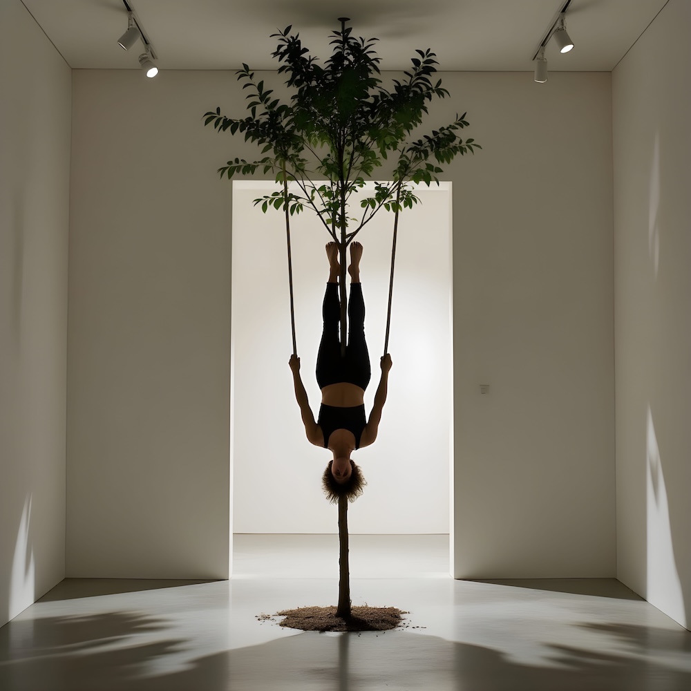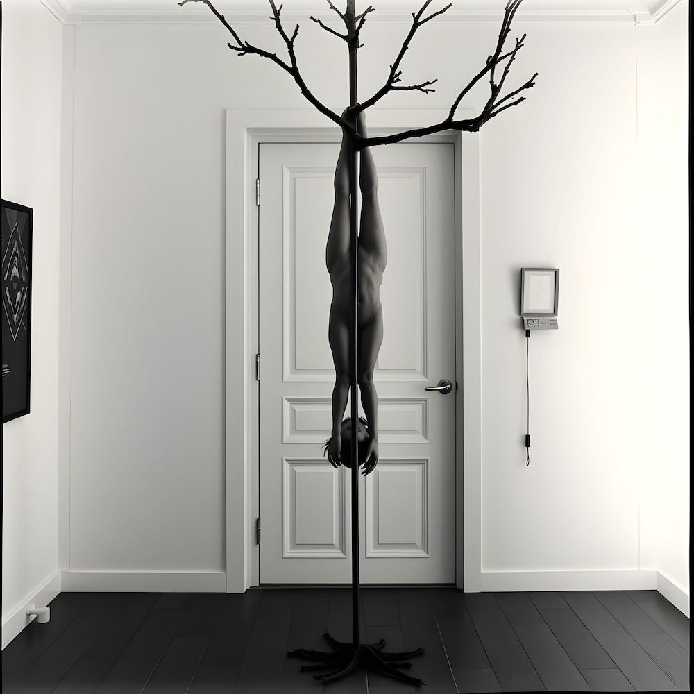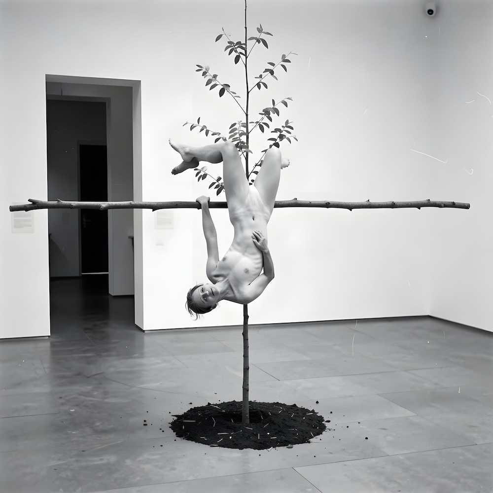 Performance art - 23 February 1990 - I was hanging naked upside down on a tree which I had brought into the gallery. Between my body and the door a long stick was stuck. An AI image for my 'Body Art' performance. The description above was the prompt for the generated image. An image generated by an AI Machine Learning Model Property of the artist. | ||