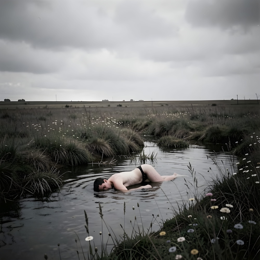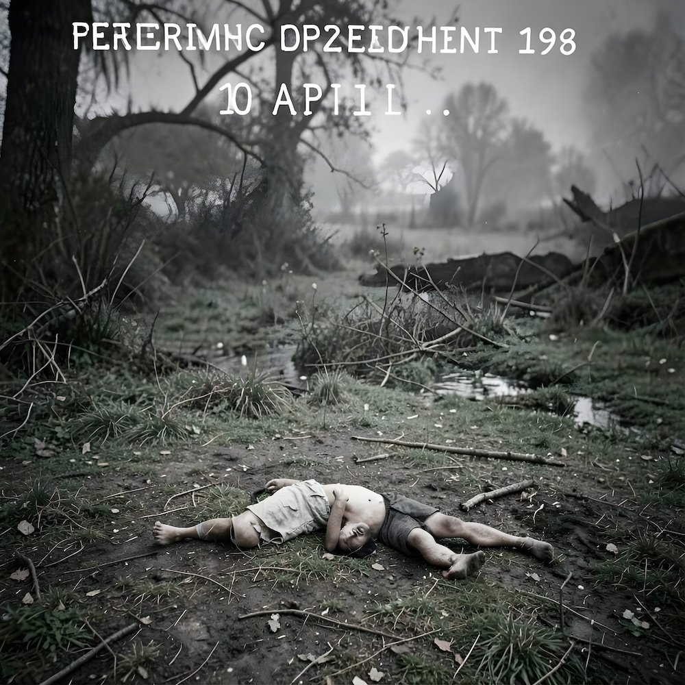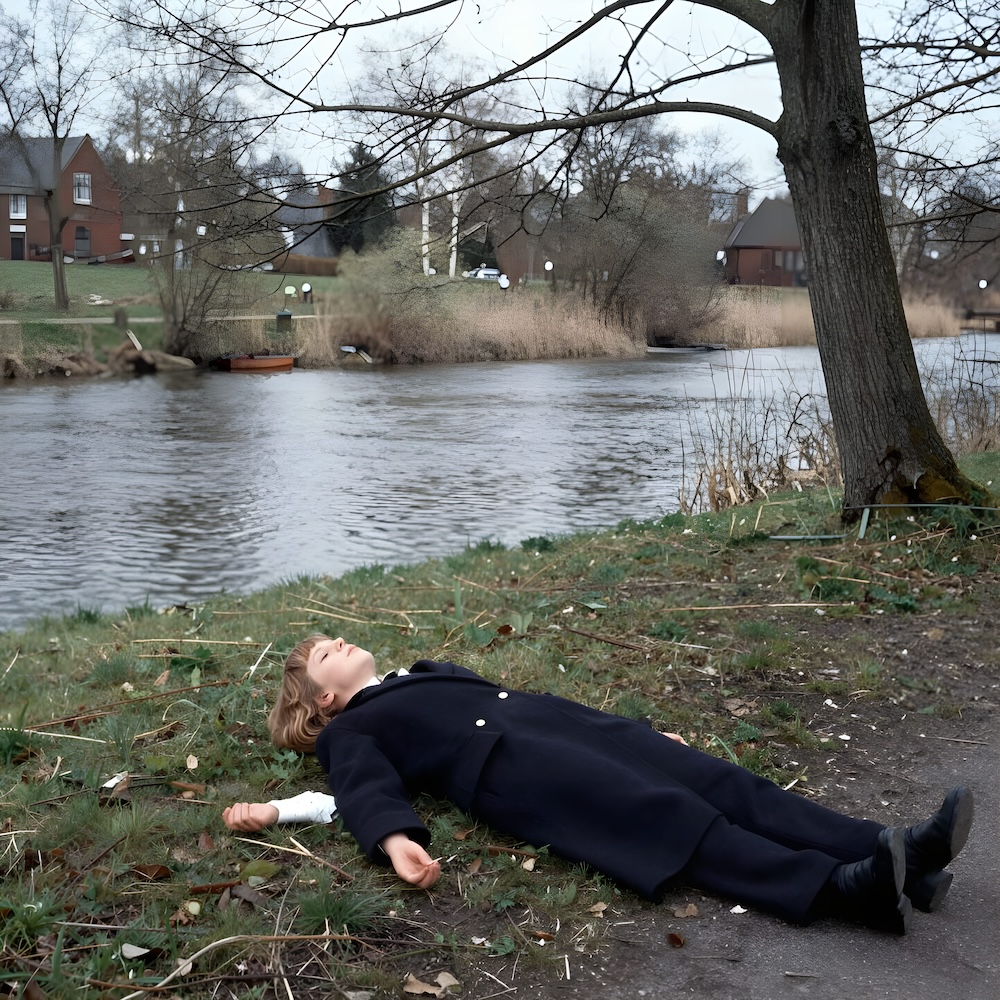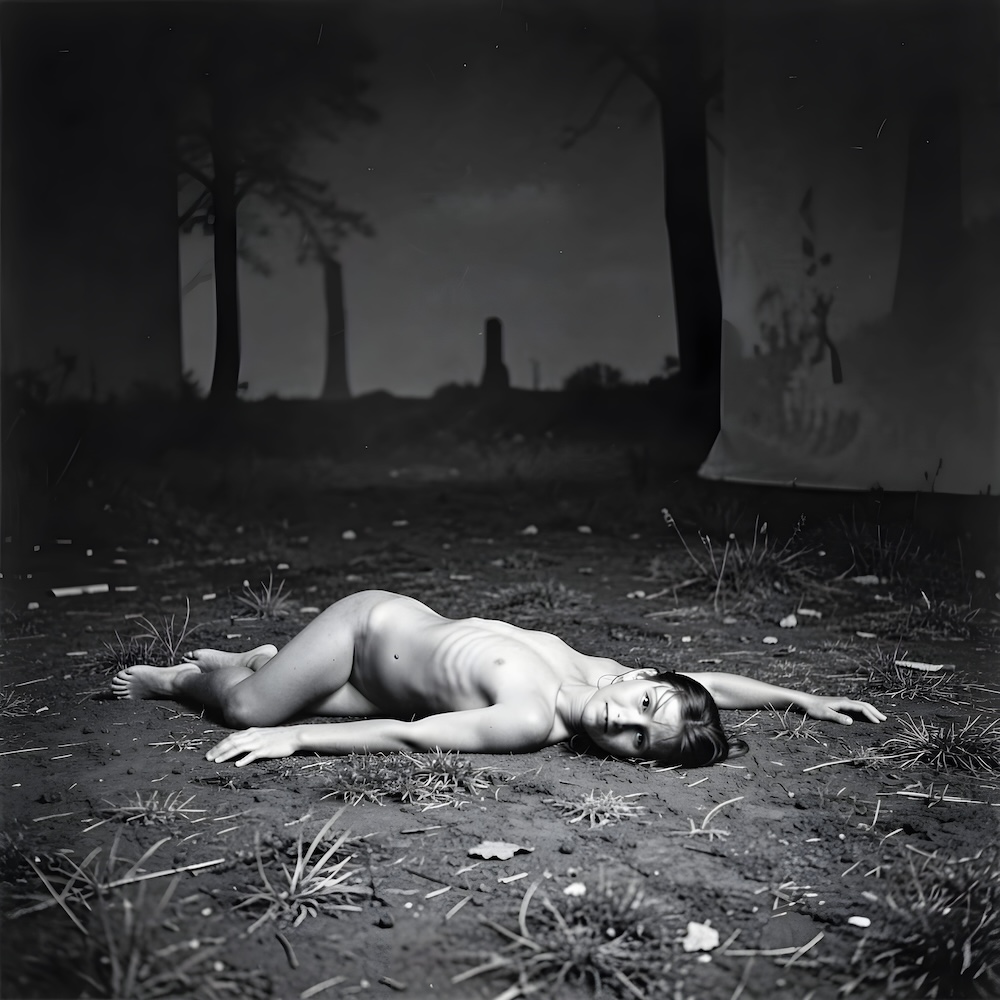 Performance art - 10 April 1993 - On the location where Joachim ‘Jockel’ Kroll aka The Ruhr Hunter killed 5-year-old Ilona Harke on 22 December 1966 I lay naked for a short while. Nobody was present. An AI image for my 'The Murder of Ilona Harke' performance. The description above was the prompt for the generated image. An image generated by an AI Machine Learning Model Property of the artist. | ||