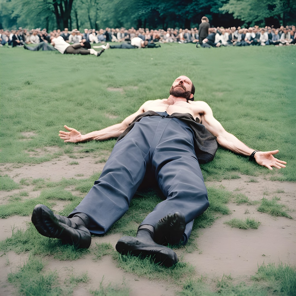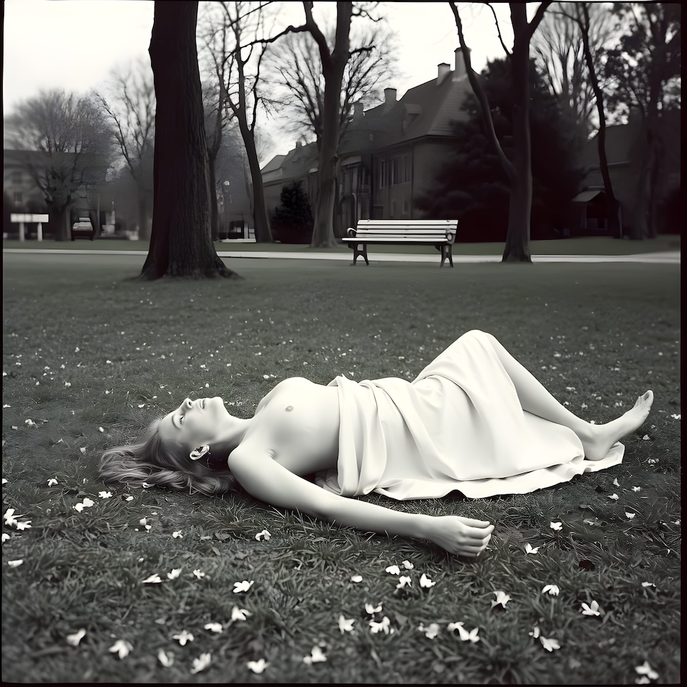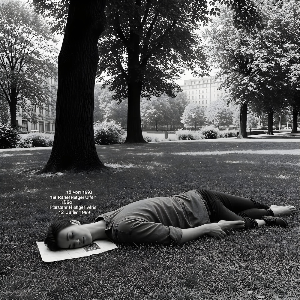 Performance art - 15 April 1993 - On the location where Joachim ‘Jockel’ Kroll aka The Ruhr Hunter killed Maria Hettgen in a park on the Hardenberger Ufer on 12 July 1969 I lay naked for a short while. Nobody was present. An AI image for my 'The Murder of Maria Hettgen' performance. The description above was the prompt for the generated image. An image generated by an AI Machine Learning Model Property of the artist. | ||