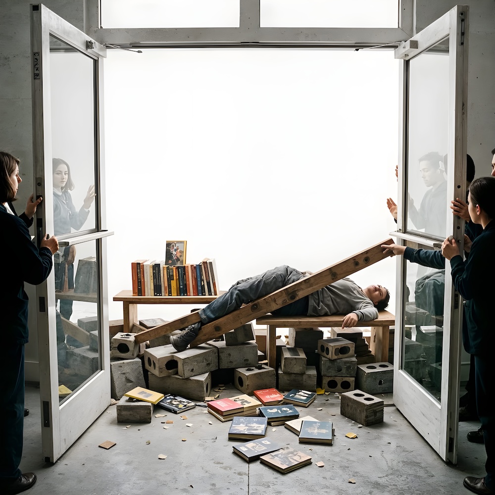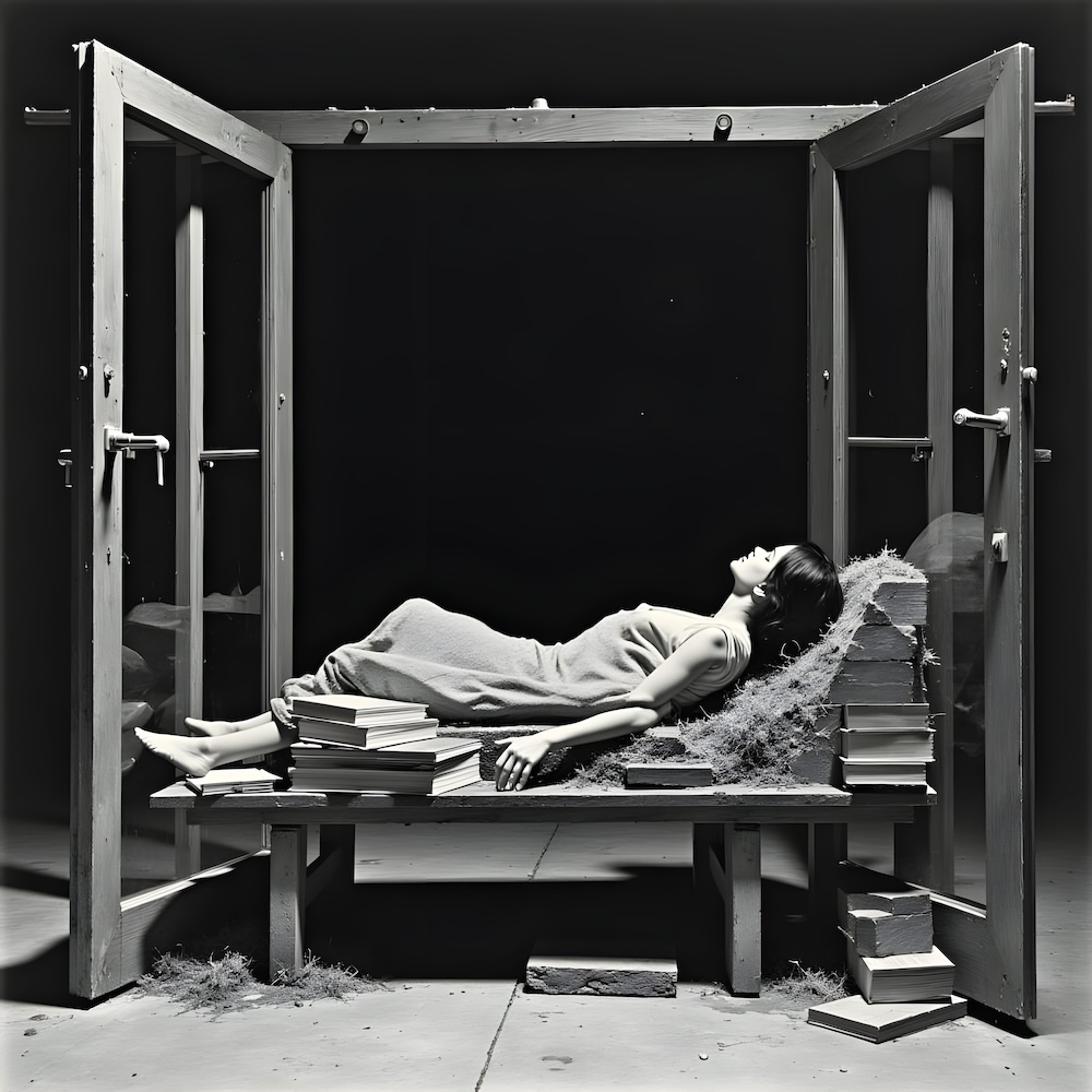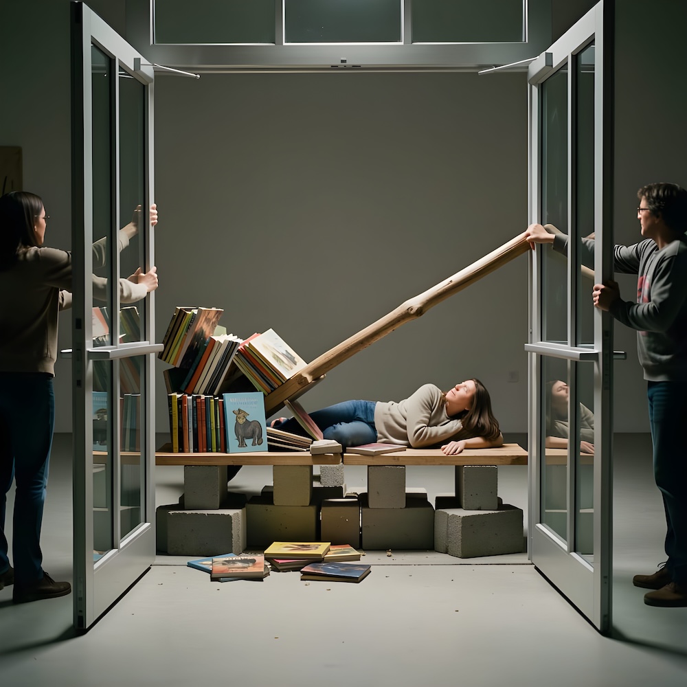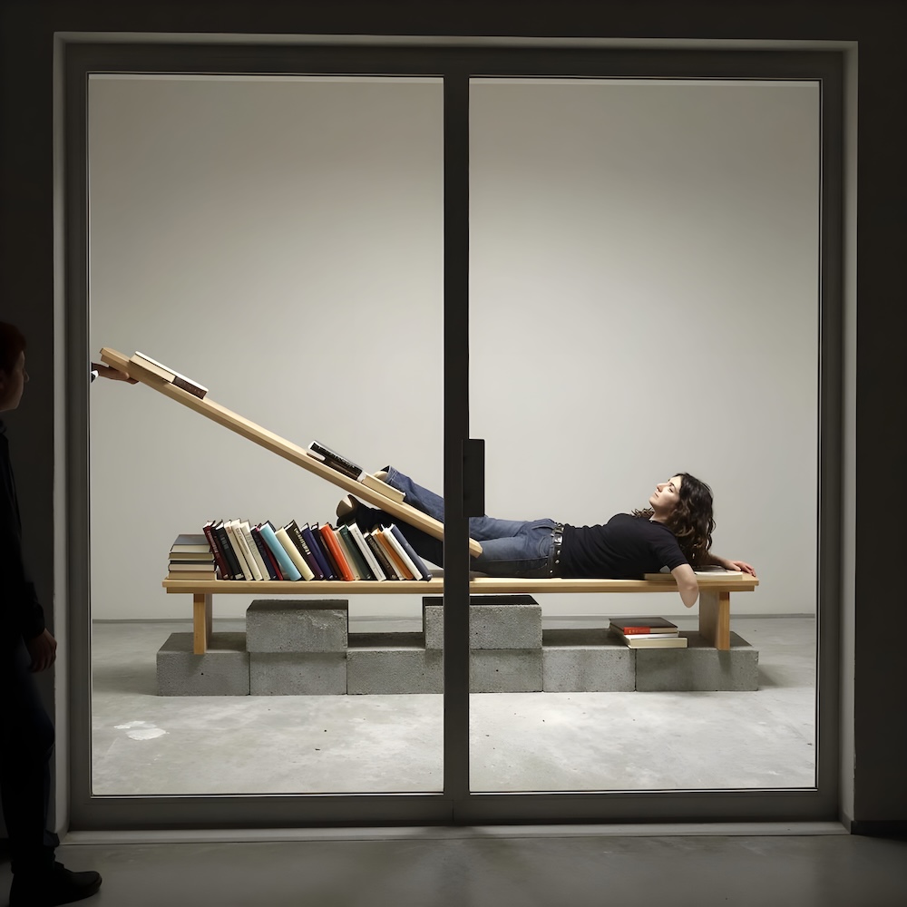 Performance art - 12 December 2000 - A double glass door with a long piece of wood attached to both sides. Inside two benches are placed on a heap of concrete bricks. On one bench stands a fine selection of art books from the school’s library I am stretched out on the other bench. The spectators can choose to open a door and push forward the piece of wood and make the bench tumble over. At first the books go down on the floor after that I go down on the floor. An AI image for my 'DDV en Danger' performance. The description above was the prompt for the generated image. An image generated by an AI Machine Learning Model Property of the artist. | ||