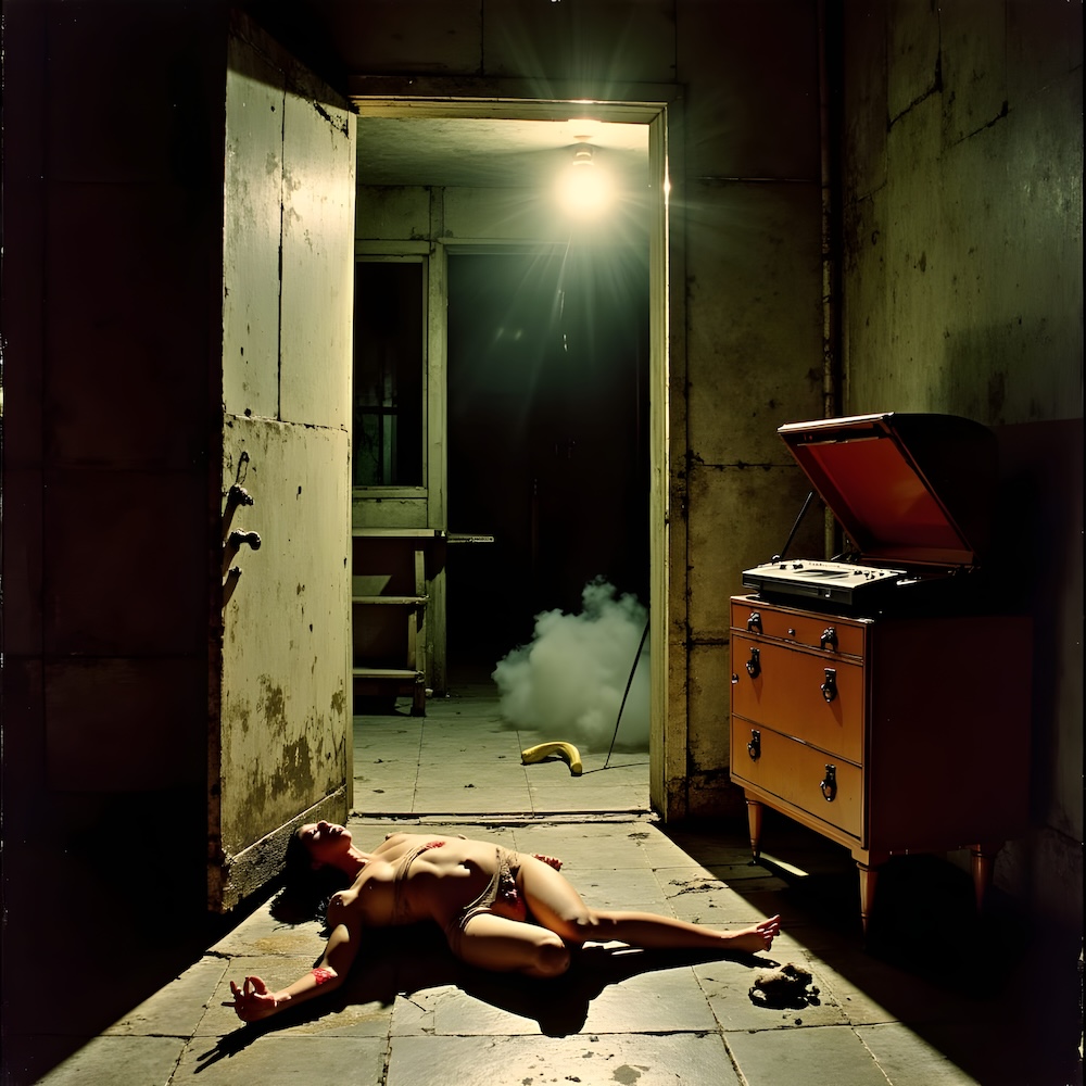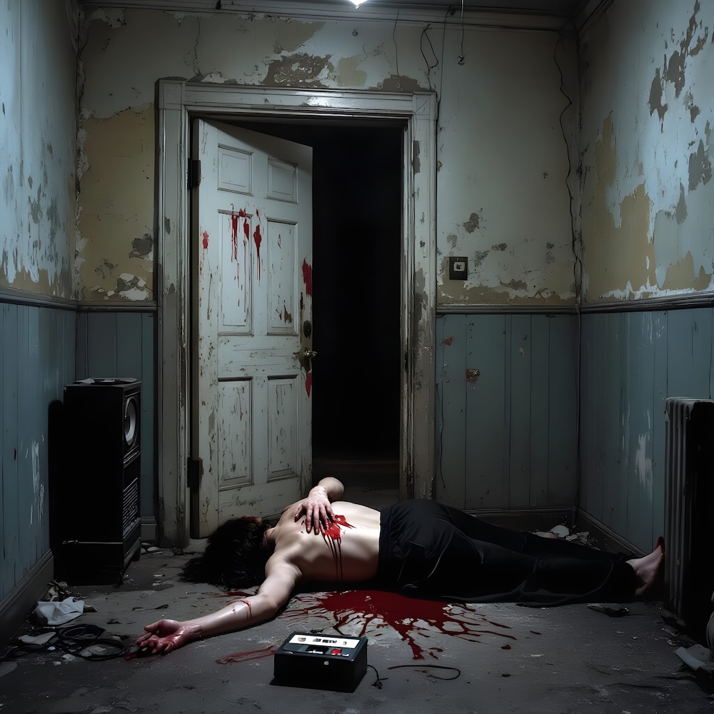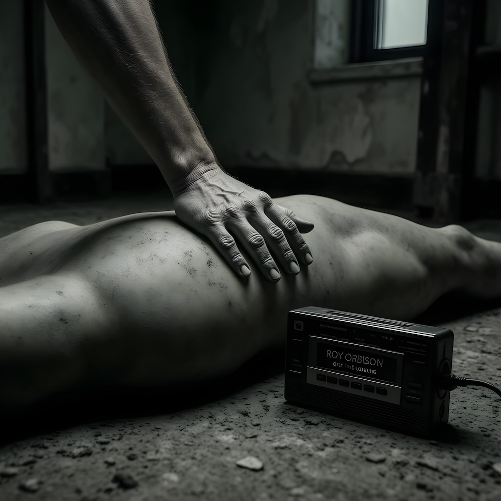 Performance art - 17 January 2002 - In an abandoned brothel I lay on the floor in one of the back rooms. The door was slightly ajar and people could only see the performance by sticking their head inside. I made a machine with a cast of my hand that caressed my back until it bled. A cassette player played Roy Orbison’s ‘Only the Lonely’ all the time. An AI image for my 'Only the Lonely' performance. The description above was the prompt for the generated image. An image generated by an AI Machine Learning Model Property of the artist. | ||