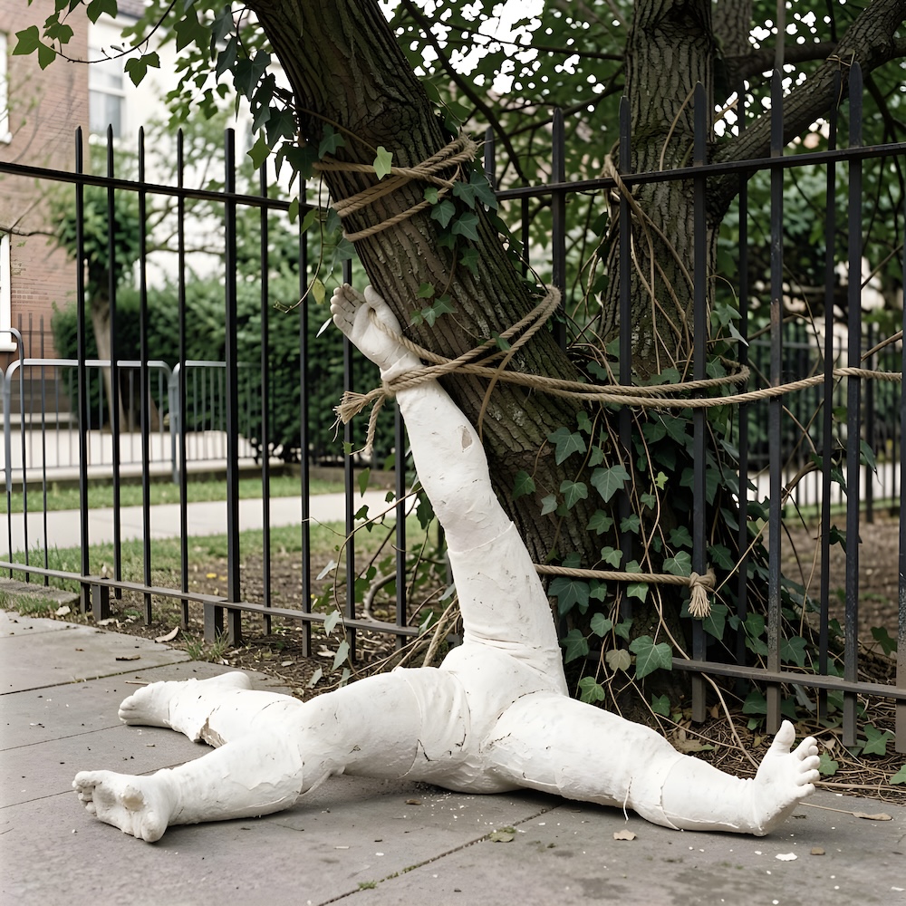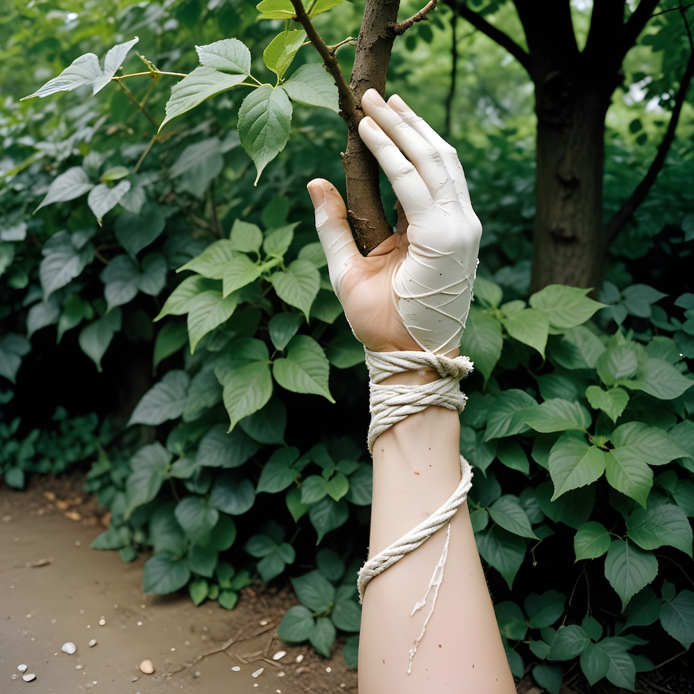 Performance art - 8 May 2002 - On Montée de l'Observance I tied my arm or leg to a branch or foot of a tree or to a metal fence with a piece of rope or hedera. Then I put a plaster cast over everything. I cut myself loose and left the plaster cast behind. An AI image for my 'Fleur de Peau - 1' performance. The description above was the prompt for the generated image. An image generated by an AI Machine Learning Model Property of the artist. | ||