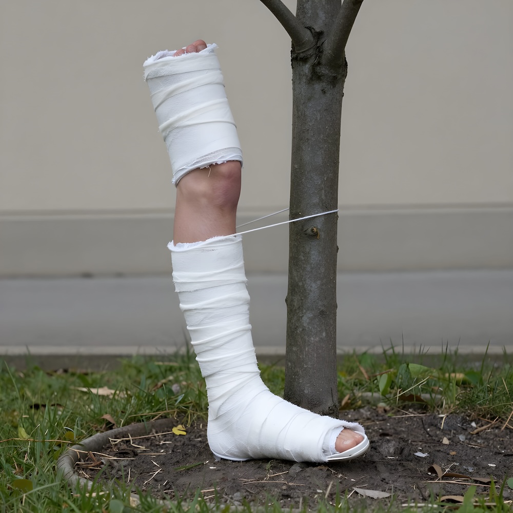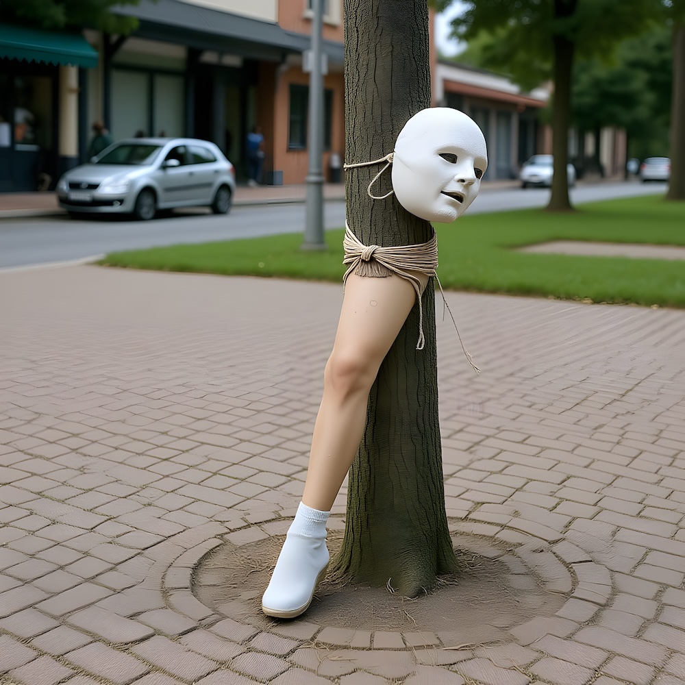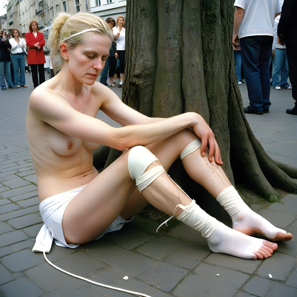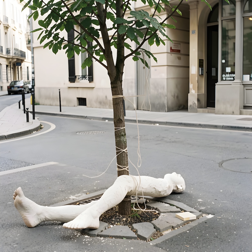 Performance art - 10 May 2002 - On Quai St. Vincent I tied my leg to a small tree with a piece of thread. Then I put a plaster cast over everything. I cut myself loose and left the plaster cast behind. An AI image for my 'Fleur de Peau - 5' performance. The description above was the prompt for the generated image. An image generated by an AI Machine Learning Model Property of the artist. | ||