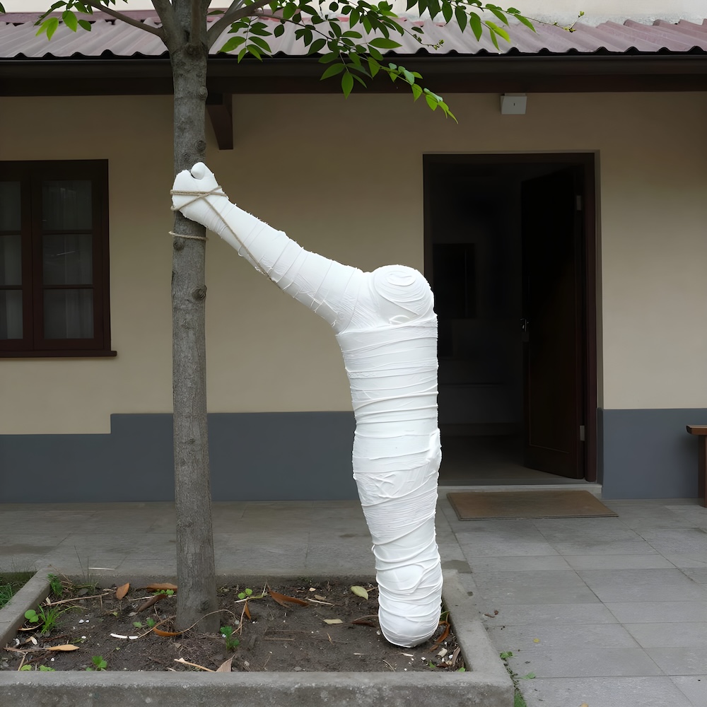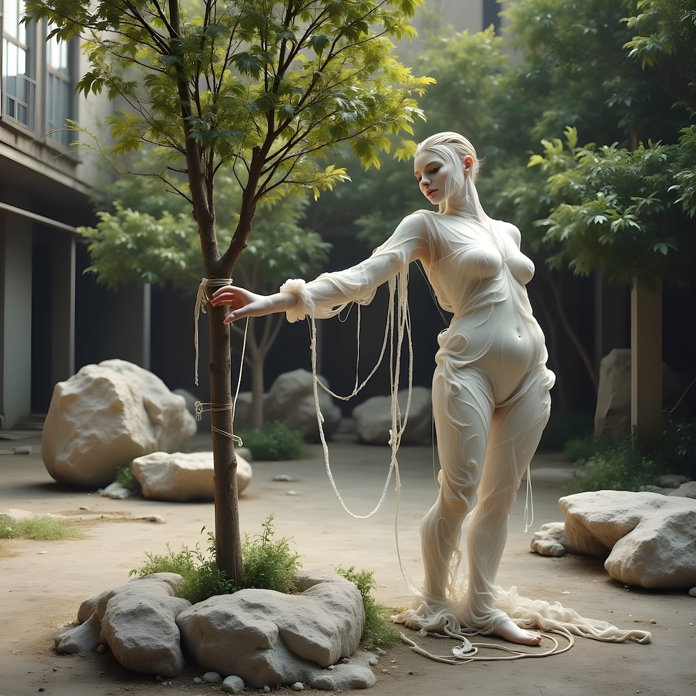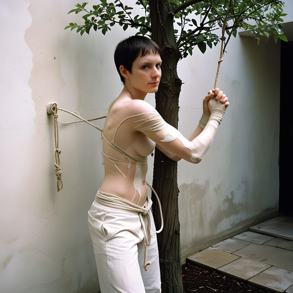 Performance art - 10 May 2002 - In the entrance courtyard I tied my arm to a small tree with a thin rope. Then I put a plaster cast over everything. I cut myself loose and left the plaster cast behind. An AI image for my 'Fleur de Peau - 6' performance. The description above was the prompt for the generated image. An image generated by an AI Machine Learning Model Property of the artist. | ||