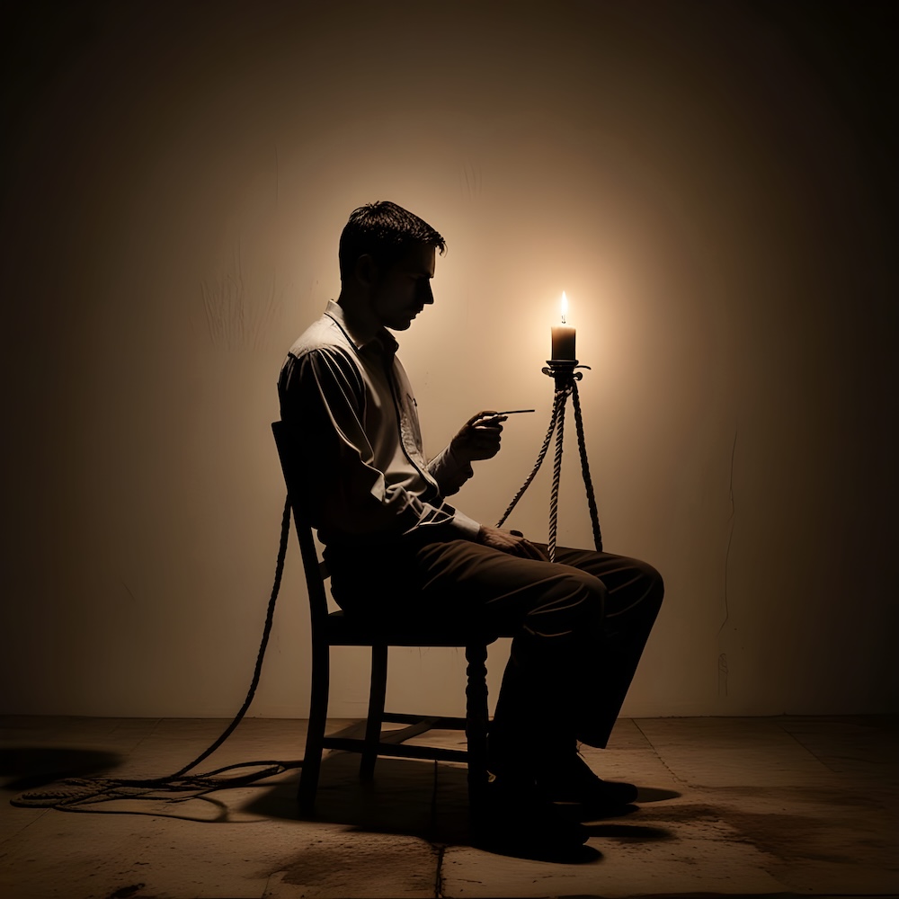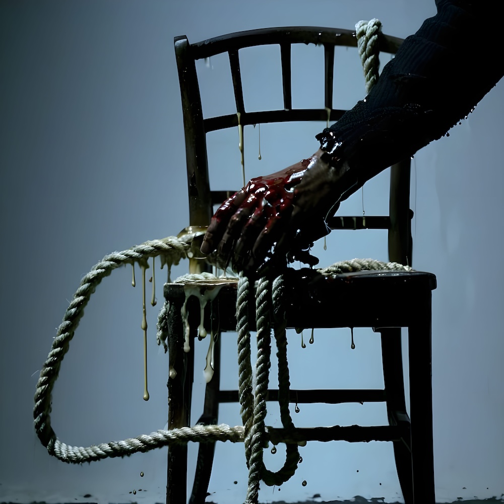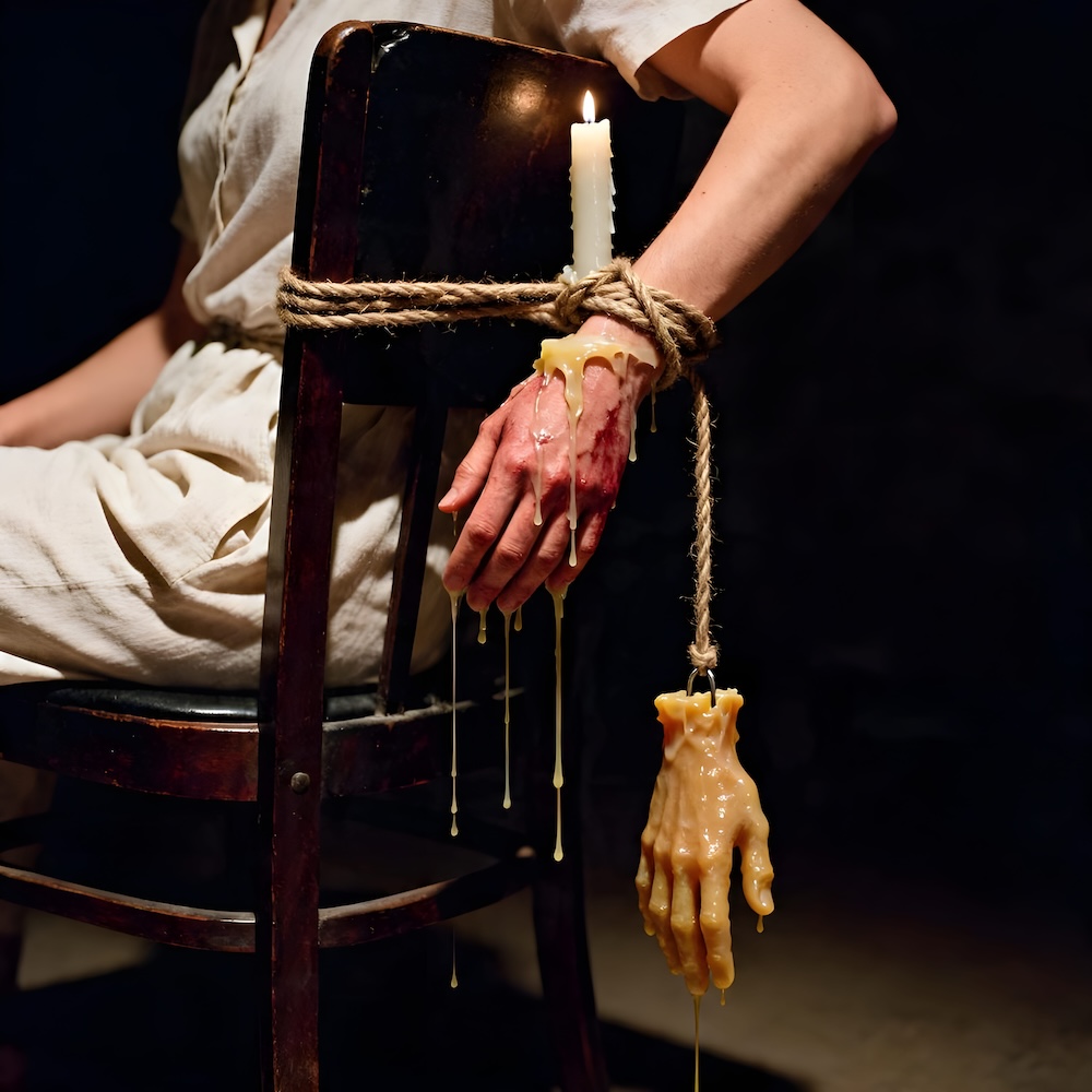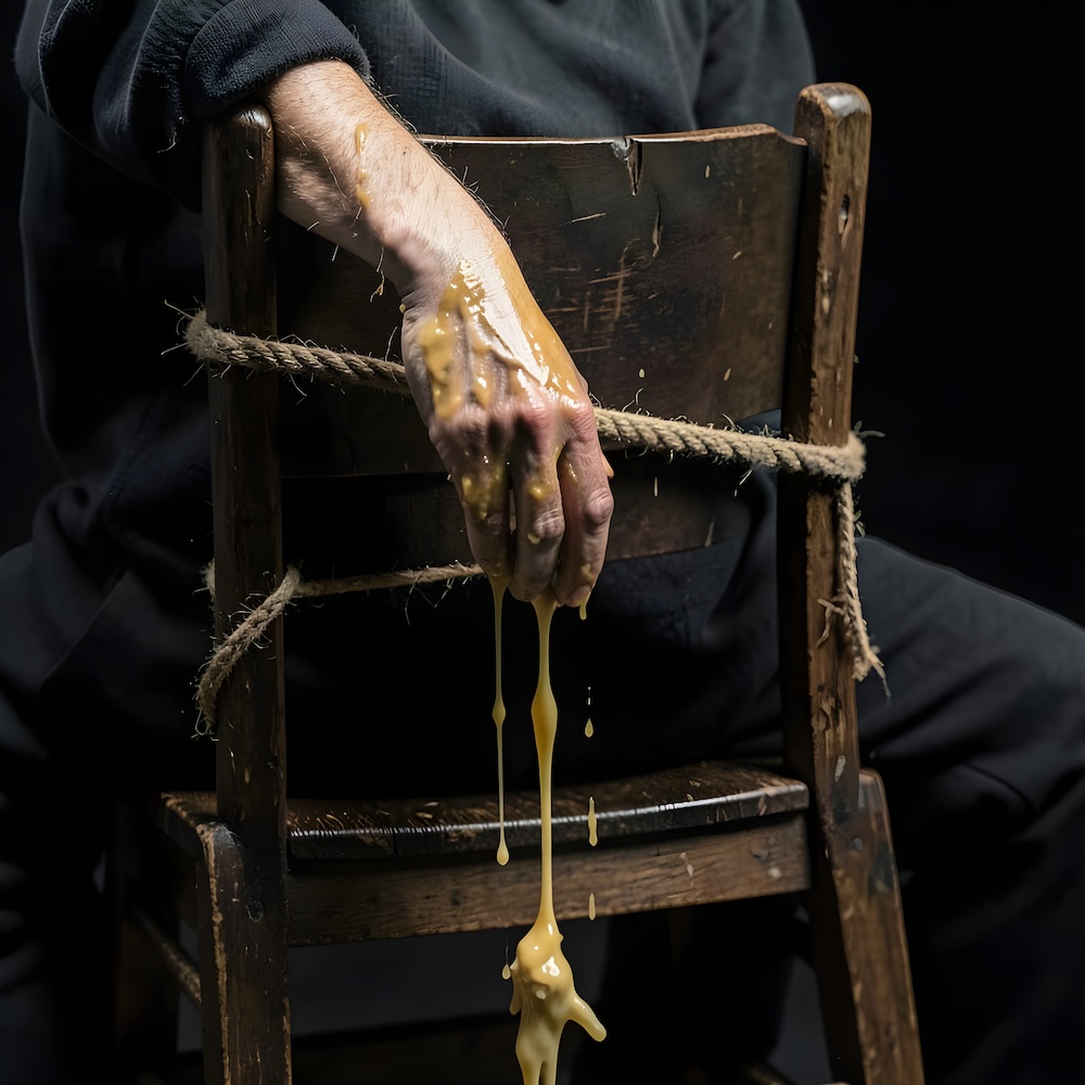 Performance art - 11 May 2002 - I sat on a chair and tied my hand to the back of it. Then I let the wax of candles drip over my hand and the back of the chair. I cut my hand loose and left the wax cast behind. An AI image for my 'Fleur de Peau - 7' performance. The description above was the prompt for the generated image. An image generated by an AI Machine Learning Model Property of the artist. | ||