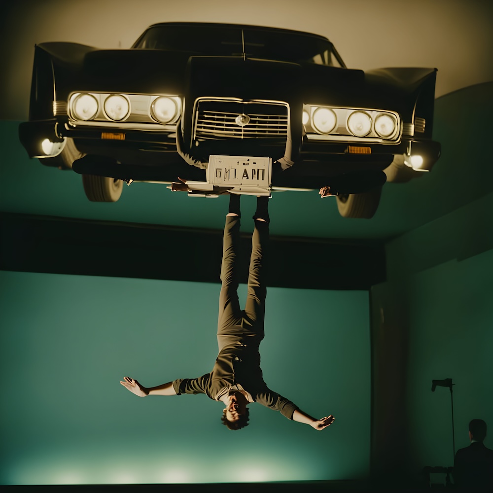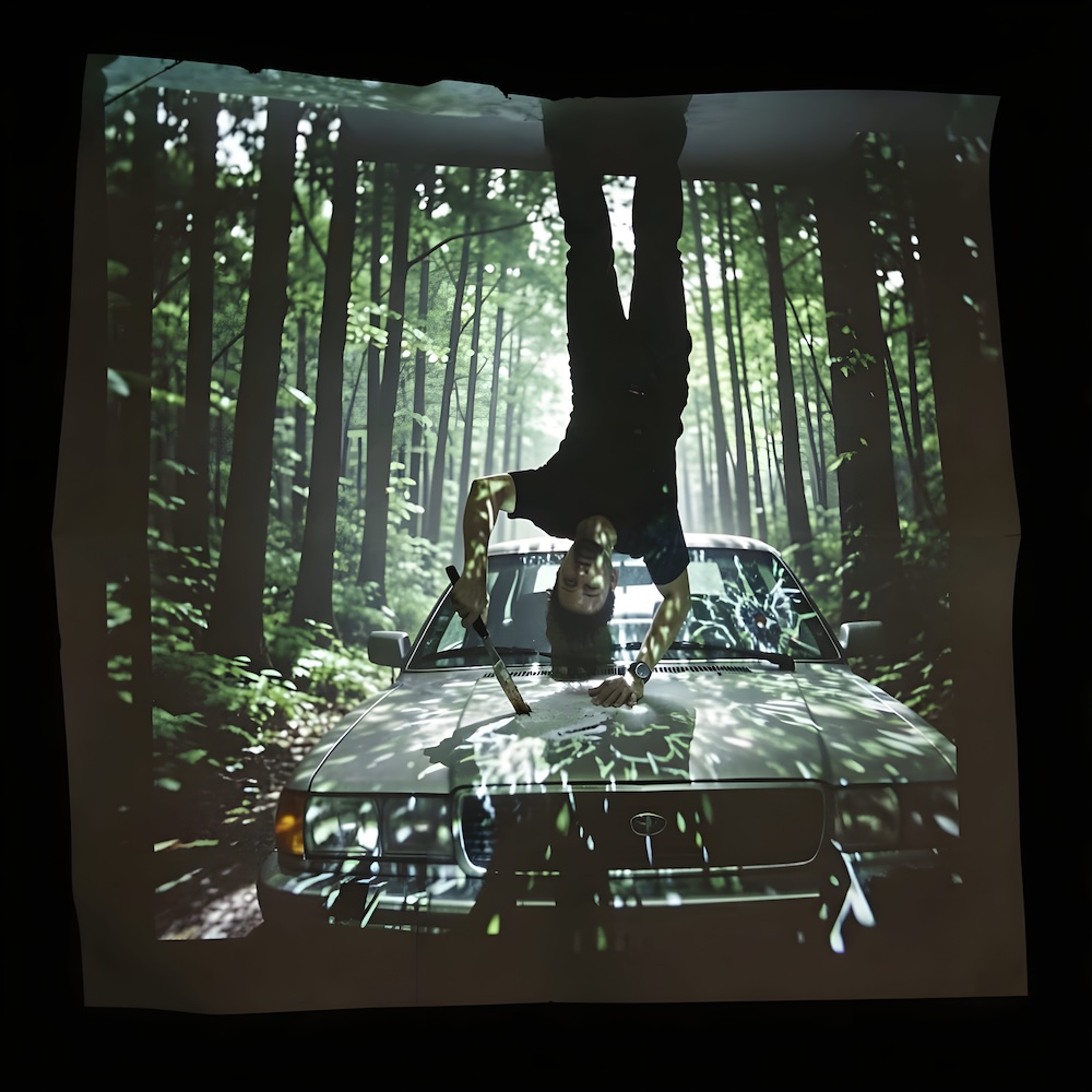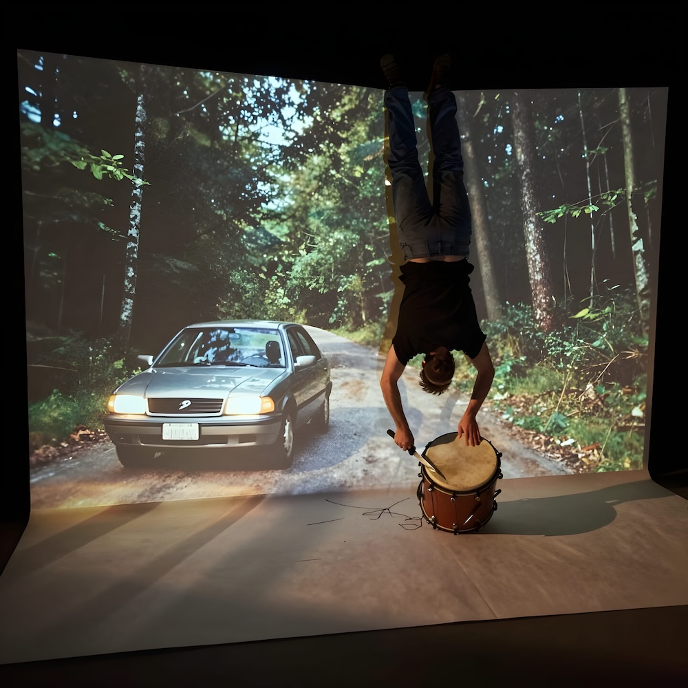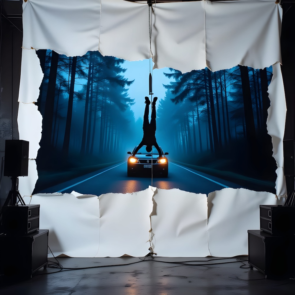 Performance art - 11 May 2002 - On a large sheet of paper a filmloop of a nocturnal car drive through a wood was projected. A very loud drum’n’bass soundtrack was played through the sound system. I was hanging upside down behind the sheet of paper and slowly carved through it with a knife. An AI image for my 'Diesel Cutter' performance. The description above was the prompt for the generated image. An image generated by an AI Machine Learning Model Property of the artist. | ||