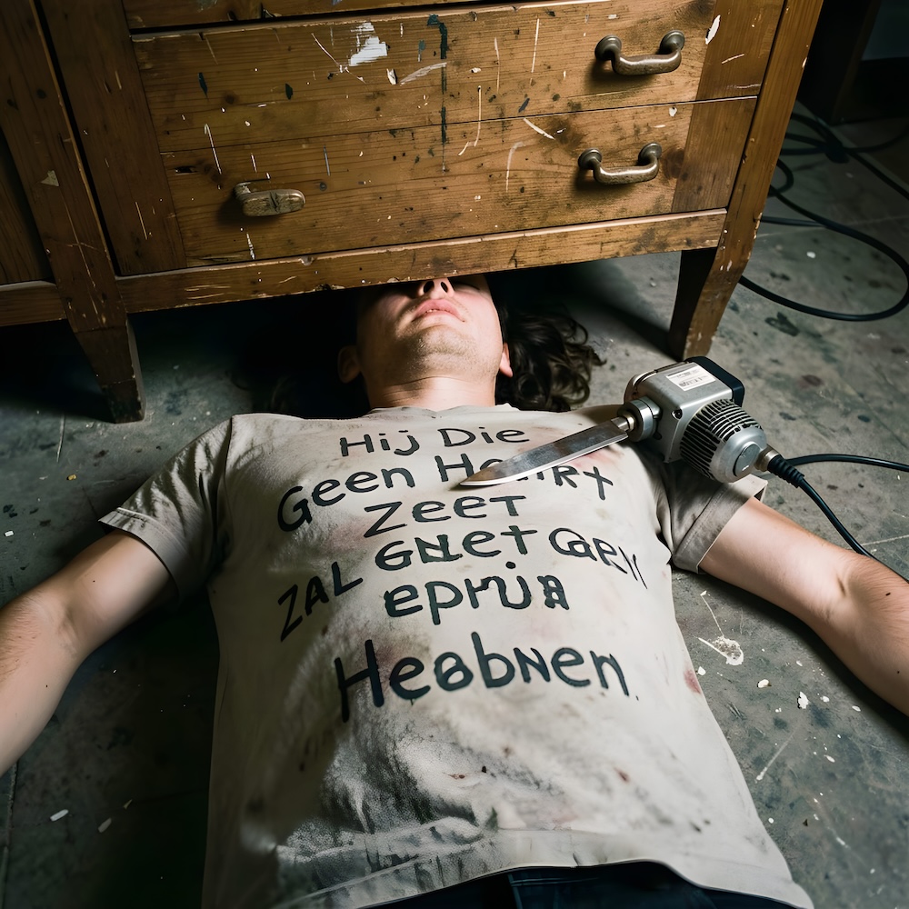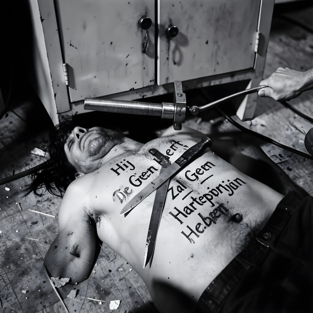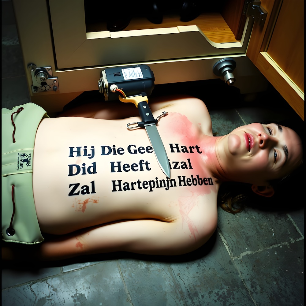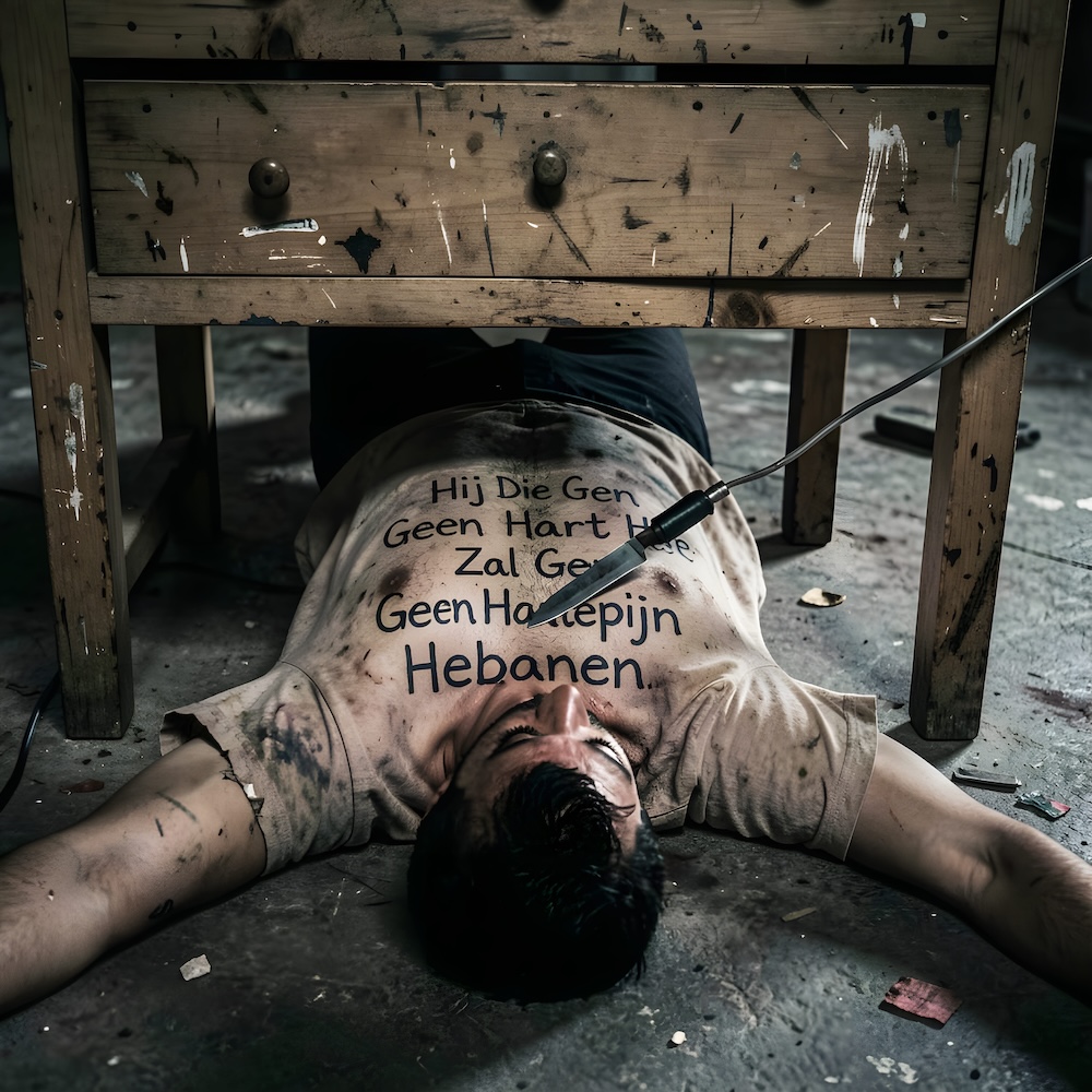 Performance art - 26 May 2004 - I lay on the floor with my head under a cupboard. On my chest is written “He Who Has No Heart Will Have No Heartaches”. Driven by an electric motor a knife cut back and forth over my chest. The performance continued for one hour. An AI image for my 'Hij Die Geen Hart Heeft Zal Geen Hartepijn Hebben' performance. The description above was the prompt for the generated image. An image generated by an AI Machine Learning Model Property of the artist. | ||