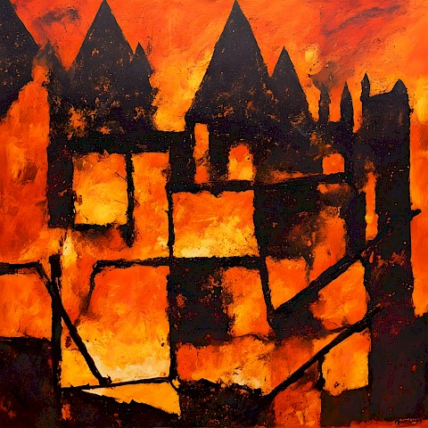 One of the two oil paintings of this subject exhibited in 1835; the other, taken from a more distant viewpoint down river, was exhibited at the Royal Academy and is now in the Cleveland Museum of Art. For the watercolours done at the time and subsequently see Nos. 456-60. This is one of the paintings for which there are eyewitness accounts of Turner's activity on the Varnishing Days before the opening of the exhibition to the public. 'The picture sent in was a mere dab of several colours and "without form and void" , like chaos before the creation,' wrote E. V. Rippingille (see Finberg 1961, pp.351-2, for a fuller version); 'for the three hours I was there - and I understood it had been the same since he began in the morning - he never ceased to work, or even once looked or turned from the wall on which his picture was hung. A small box of colours, a few very small brushes, and a vial or two, were at his feet. ... In one part of the mysterious proceedings Turner, who worked almost entirely with his palette knife, was observed to be rolling and spreading a half-transparent stuff over his picture, the size of a finger in length and thickness. As Callcott was looking on I ventured to say to him "What is that he is plastering his picture with ?" to which inquiry it was replied "I should be sorry to be the man to ask him." ... Presently the work was finished: Turner gathered his tools together, put them into and shut up the box, and then, with his face still turned to the wall, and at the same distance from it, went sidelong off, without speaking a word to anybody. •.. Maclise, who stood near, remarked, "There, that's masterly, he does not stop to look at his work; he knows it is done, and he is off"!' The Spectator for 7 February 1835 made allusion to this activity of Turner's: 'And the execution of the picture is curious: to look at it close, it appears a confused mass of daubs and streaks of colour; yet we are told the painter worked at it within a few inches of the canvas for hours together, without stepping back to see the effect. Turner seems to paint slovenlily [sic] - daubing, as one would say; yet what other painter preserves equal clearness of colour? Not that we like this scenepainting manner; we should prefer being able to look at a picture near as well as at a distance; but such a one as this we are content to look at in any way the artist chooses - with all its faults.' The Spectator went on to point out that the picture stood out from its neighbours through its 'purity, transparency, and harmony of colouring', not through its 'quantity or intensity'. It praised the various effects of light, with the qualification that 'There is an effect of daylight in the picture, however, which is not counterbalanced by the gaslamp in the foreground', and that the figures were too bad for one to distinguish whether they were 'Christians or Pagans, fine ladies or coalheavers'. The Times for 10 February also asserted that 'The sky is painted in much too light a tint, and is more applicable to a morning than a night scene', and the Athenaeum for 14 February called the picture 'a splendid impossibility' for the same reason; 'truth is sacrificed for effect, which, however, is in parts of the picture, magnificent' . However, the Literary Gazette for 14 February pointed out that Turner had achieved his effects 'not by any striking opposition of light and dark', but by 'the contrast of warm and cold, of the blazing flame and of the early morning' morning'. Turner was later to use a similar contrast for emotional effect in 'The Fighting Temeraire' (National Gallery, London, 524). The Literary Gazette summed up the picture as manifesting 'quite as much of vision and poetry as of nature'. A later issue, on 25 April, noted that the picture had been bought by C. Hall, and by 1852 it belonged to Charles Birch of Edgbaston. An image generated by an AI Machine Learning Model Property of the artist. | ||