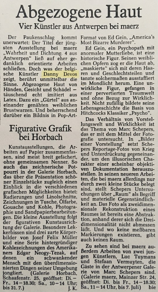 Der Paukenschlag kommt unerwartet: Der Titel der jüngsten Ausstellung bei maerz „Wahrheit und Dichtung. 4 aus Antwerpen" ließ auf eher gedanklich orientierte Arbeiten schließen. Doch was der belgische Künstler Danny Devos zeigt, berührt unmittelbar die Sinne. Abgezogene Haut von Händen, Gesicht und Schädeltäuschend echt imitiert aus Latex. Dazu ein „Gürtel" aus aneinander genähten weiblichen Brustwarzen. Und beherrschend darüber ein Bildnis in Pop-Art-Format von Ed Gein, „America's Most Bizarre Murderer" Ed Gein, ein Psychopath mit anormaler Mutterliebe, ist eine historische Figur. Seinen weiblichen Opfern zog er die Haut ab, „maskierte" sich mit deren Haaren und Geschlechtsteilen und tanzte solchermaßen ausstaffiert im Mondlicht herum. Eine unwirkliche Figur, gefangen in einer pervertierten Traumwelt und ohne Bezug zur Wirklichkeit. Nicht zufällig bildete seine Lebensgeschichte die Basis von Hitchcocks Klassiker „Psycho" Das Verhältnis von Vorstellungswelt und Wirklichkeit ist das Thema von Marc Schepers, das er mit dem Mittel der Fotoeiner Vorstelucht Setzt Sicher Schepers Reportage-Fotos von Krieg und Unterdrückung gegeneinander, um den illusorischen Charakter einer scheinbar objektiven Dokumentation herauszustellen. In seinen neueren Arbeiden die vei meine allerdings leut sind, stellt Schepers Untersuchungen über „Raum" als Begriff und materielle Gegenständlichkeit an. Das Foto als zweidimensionale Rekonstruktion eines Raumes ist bereits eine Abstraktion, anhand derer sich die Dreidimensionalität nicht abmessen läßt. Und wo keine meßbaren Markierungen existieren, gibt auch keinen Raum. Zu sehen sind bei maerz auBerdem Arbeiten von zwei jungen Künstlern, Luc Tuymans und Stefaan Vermuyten, die Gäste in der Antwerpener Galerie von Marc Schepers sind (Galerie maerz, Mainzer Str. 24, geöfinet: Di. bis Fr., 14 - 18.30; Sa., 11-14 Uhr, bis 7. Juli) bie