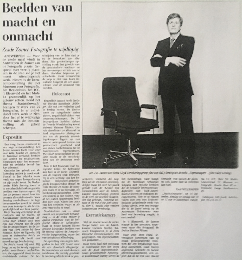 De jongste tijd is er een toenemende belangstelling voor de problematiek van de macht. Macht niet alleen in de politieke betekenis, maar ook als seksuele, etnische, sociale, ideologische machtsuitoefening, stelt de catalogustekst. Die macht - in al haar facetten - trachten de fotografen te tonen. In het Elzenveld bijvoorbeeld heeft de Duitse fotograle Bettina Flitner in de buitenlucht levensgrote foto's opgehangen van vrouwen die op straat gefotografeerd werden. Ze heeft ze een speeigoedwapen: speer, geweer of mes, laten kiezen waarmee ze poseren. in de (Duitse) teksten onder de toto's verklaren de vrouwen wie de grootste vijand is die ze graag te lijf willen gaan. Dat gaat van hun vriendje dat alleen aan seks denkt, of hun ex-man, tot alle politici of de paus. Macht, dat zun ook de apparaten waarmee de macht uitgeoefend wordt. In het ICC exposeert Lucinda Devtin haar Omega Suites': klinisch keurige foto's, als uit een verkoopscatalogus, van eiektrische stoelen, gaskamers, en injectiebedden, waarmee terdoodveroordeeiden in de V.S. geëxecuteerd worden. En er zin de tatels van de macht' te zien: fotografe Jacqueline Hassink fotografeerde de vergadertafels van grote multinationals als Electricité de France of BMW. in het Muhka toont Eddy Seessing grote portretten van Nederlandse topmanagers en hun directiestoel Deze foto's tonen niet alleen de attributen, de slachtofters of bezitters van de macht, maar vooral ook de onmacht van de fotogralse De levensgrote vrouwenpürtretten uit 'Mann Feind van Bettina Fitner driven vooral op hun onderteksten or de machtsrelaties duidelgk te maken. De vergadertatels uit Thie Table of Power van Hassink zeggen eigenlik bizonder weinig over macht, veel over het gebrek aan verbeelding van grote bedniven. Al die vergaderzalen met hun ronde of langwerpige tafels zien er ongeveer hetzeitde uit. Net zoals al die gnizende topmanagers van Seessing in hun keurige maatpak• ken onderting ongeveer even verwisselbaar zin ais hun directiestoelen. Foto's, beelden, blijken niet voldoende om de machtsrelaties (e tonen. Macht is niet tets uiterlyks. het is niet te fotograferen. Geen wonder dan ook dat Massink bij haar tafels gedetailleerde technische fiches voegt, waarbij zelfs de kwaliteit van de koffie die ze aangeboden kreeg niet onvermeld bljf (Ciba-Geigy: 'good coffee, nice people ). Ook Karen Knorrs foto's van de luxe 'upper class' inteneurs in de Londense Belgraviawijk worden slechts dank aij de onderschriften hoogst ironisch. En Barbara Alpers uitvergrote televisiebeelden van de Goltoorlog knijgen precies hun kracht door de brutaliteit of absurditeit van de ondertitels die ze mee gefotografeerd heeft. De problemen van de traditionele fotogratie met een onderwerp als 'macht/onmacht' worden misschien het best duidelik gemaakt door het werk van de bekendste, meest gelauwerde onder de getoonde fotograten: de Brazilaan Sebastiao Saigado. In het Hessenhuis wordt werk van hem getoond dat hij in Mexico in 1980 Brazilié in 1983 en Ecuador in 1992 heeft gefotografeerd. Deze selectie van zijn toto's is misschien niel helemaal overtuigend (een tentoonstelling in Charteroi met foto's over het werk in een zilvermin was alleszins sterker). Salgado hanteert de fotografie op een erg esthetiserende, mythofogiserende, ja haast refigieuze manier. Beelden als een hond die waakt op een graftombe of kinderen die bikkelen met de botjes van skeletten roepen de morbide geest van de Spaanse barokkunst uit de 17de eeuw op. Salgado maakt besist uterst fraaie en vakkundige kunstfoto's. Maar door de gelikte, professionele wijze waarep hj de armoede en achteruitstelling van de Zuid-Amerikaanse Indianen fotografeert, doet hij ongewild afbreuk aan het getoonde. Hij trekt een esthetisch scherm op tussen de kyker en het onderwerp 'Beelden hebben een verregaande 'religieuze' impact. Ze begraven de geschiedenis.' Dat zinnetje van Vicenç Altaio is een perfecte commentaar op de beeiden van Salgado - ook al staat het tvee kilometer verder bi ander werk in het Muhka te lezen. Dat de fotografie de werkelijkheid niet heeft te begraven, wordt op dezelfde zolder van het Hessenhuis aangetoond door een installatie van Danny Devos. Devos is al jaren gefascineerd door seriemoordenaars. Hier, in 'De Wurger van de Linkeroever', toont hij bladzijden uit de Antwerpse kranten uit de jaren 60 waarvan alleen de artikels over de moorden niet overschilderd zijn. Op zuiltjes toont Devos kleine fotootjes van hemzelf en zijn problematisch alter ego, de wurger, waarmee hij ondertussen al jaren correspondeert. Devos heeft het morbide en barokke gemeen met Salgado. Maar hij weet ons wel confronteren met de gruwelijke aspecten van de werkelykheid, zonder ze esthetisch te begraven. De begraven foto Genocide en massaslachtingen ontbreken niet in deze tentoonsteiling. Dirk Reinartz toont in het Museum voor Fotografie klinische zwart-wit foto's van de concentratiekampen, van Breendonk tot Auschwitz. Rudolt Herz merkte bij een bezoek aan de permanente tentoonstelling in Dachau dat sommige foto's van nazibeulen er door de geémotioneerde bezoekers bekrast en beschadigd werden. Herz toont in het ICC uitvergrotingen van deze extra-fotografische commentaar op de onginele foto's: het is alsof de woedende bezcekers wilden verhinderen dat deze foto's de geschiedenis zouden doen vergeten. En Benni Efrat trok naar Ruanda met massa's foto en videoapparatuur. Maar haj kwam terug met alleen maar ge luidsopnames van miljoenen viiegen. In het ICC toont hỹ een rondcraaiende diaprojector die op een muskietennet de foto's van handen toont, onder andere kinderhanden die met een granaat spefen De Chieen Alfredo Jaar interesseert zich al geruime tijd voor de ontoereikendheid van beeiden. Foto's zijn hoogst problematisch voor hem. Zo problematisch dat hi ze gewoonweg met meer toont. in de zomer van 94 bezocht ook hij Ruanda. Hil nam er duizenden foto's. In het Muhka toont Jaar opgestapeide zwartlinnen archiefdozen. Wij knigen alleen die stapels zwarte