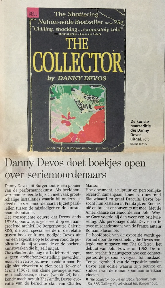 De hoofdbrok van de expositie wordt gevormd door de verzameling die Devos aanlegde van uitgaven van The Collector, het debuut van John Fowles uit 1963. De roman beschrijft nauwgezet hoe een contactgestoorde persoon overgaat tot misdaad.
