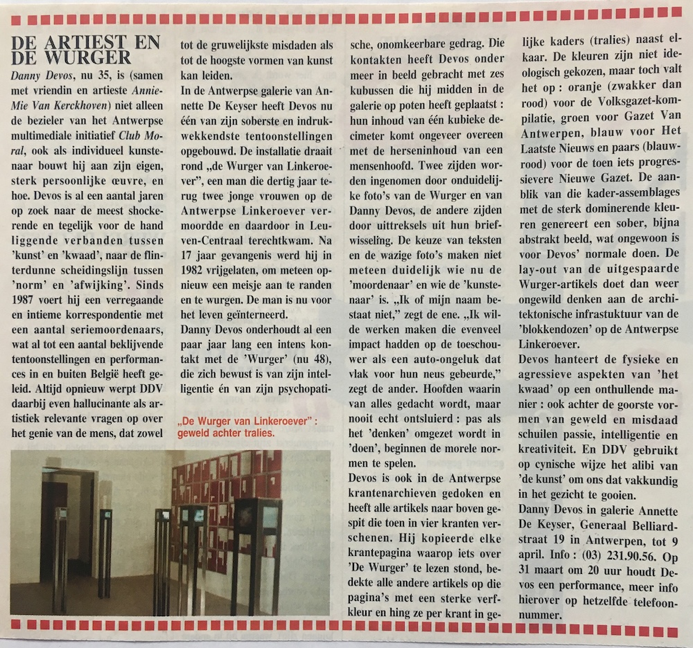 In de Antwerpse galerie van Annette De Keyser heeft Devos nu een van zijn soberste en indrukwekkendste tentoonstellingen opgebouwd. De installatie draait rond ,,de Wurger van Linkeroever", een man die dertig jaar terug twee jonge vrouwen op de Antwerpse Linkeroever vermoordde en daardoor in Leuven-Centraal terechtkwam. Na 17 jaar gevangenis werd hij in 1982 vrijgelaten, om meteen opnieuw een meisje aan te randen en te wurgen. De man is nu voor het leven geïnterneerd.