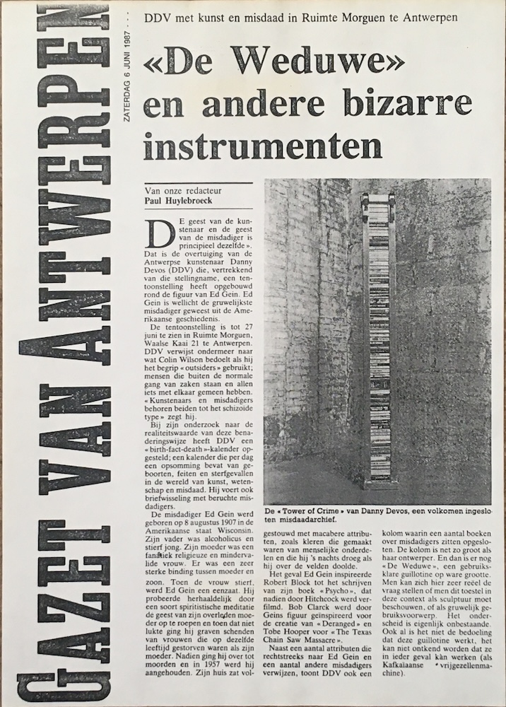 DE geest van de kunstenaar en de geest van de misdadiger is principieel dezelfde ». Dat is de overtuiging van de Antwerpse kunstenaar Danny Devos (DDV) die, vertrekkend van die stellingname, een tentoonstelling heeft opgebouwd rond de figuur van Ed Gein. Ed Gein is wellicht de gruwelijkste misdadiger geweest uit de Amerikaanse geschiedenis. De tentoonstelling is tot 27 juni te zien in Ruimte Morguen, Waalse Kaai 21 te Antwerpen. DDV verwijst ondermeer naar wat Colin Wilson bedoelt als hij het begrip « outsiders » gebruikt; mensen die buiten de normale gang van zaken staan en allen iets met elkaar gemeen hebben. « Kunstenaars en misdadigers behoren beiden tot het schizoide type» zegt hij. Bij zijn onderzoek naar de realiteitswaarde van deze benaderingswijze heeft DDV een « birth-fact-death »-kalender opgesteld; een kalender die per dag een opsomming bevat van geboorten, feiten en sterfgevallen in de wereld van kunst, wetenschap en misdaad. Hij voert ook briefwisseling met beruchte misdadigers. De misdadiger Ed Gein werd geboren op 8 augustus 1907 in de Amerikaanse staat Wisconsin. Zijn vader was alcoholicus en stierf jong. Zijn moeder was een fanátiek religieuze en mindervalide vrouw. Er was een zeer sterke binding tussen moeder en zoon. Toen de vrouw stiert. werd Ed Gein een cenzaat. Hij probeerde herhaaldelijk door een soort spiritistische meditatie de geest van zijn overleden moeder op te roepen en toen dat niet lukte ging hij graven schenden van vrouwen die op dezelfde leeftijd gestorven waren als zijn moeder. Nadien ging hij over tot moorden en in 1957 werd hij aangehouden. Zijn huis zat volgestouwd met macabere attributen, zoals kleren die gemaakt waren van menselijke onderdelen en die hij 's nachts droeg als hij over de velden doolde. Het geval Ed Gein inspireerde Robert Block tot het schrijven van zijn boek « Psycho», dat nadien door Hitchcock werd verfilmd. Bob Clarck werd door Geins figuur geinspireerd voor de creatie van « Deranged» en Tobe Hooper voor « The Texas Chain Saw Massacre ». Naast een aantal attributen die rechtstreeks naar Ed Gein en cen aantal andere misdadigers verwijzen, toont DDV ook een kolom waarin een aantal boeken over misdadigers zitten opgesloten. De kolom is net zo groot als haar ontwerper. En dan is er nog «De Weduwe», een gebruiksklare guillotine op ware grootte. Men kan zich hier zeer reëel de vraag stellen of men dit toestel in deze context als sculptuur moet beschouwen, of als gruwelijk gebruiksvoorwerp. Het onderscheid is eigenlijk onbestaande. Ook al is het niet de bedoeling dat deze guillotine werkt, het kan niet ontkend worden dat ze in ieder geval kàn werken (als Kafkaiaanse • vrijgezellenmachine).