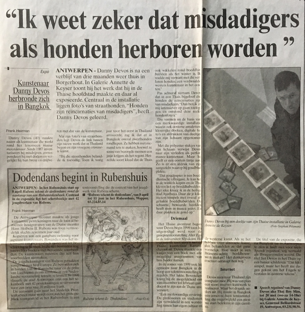 Danny Devos is na een verblijf van drie maanden weer thuis in Borgerhout. In Galerie Annette de Keyser toont hij het werk dat hij in de Thaise hoofdstad maakte en daar al exposeerde. Centraal in de installatie liggen foto's van straathonden. "Honden zijn reïncarnaties van misdadigers", heeft Danny Devos geleerd.