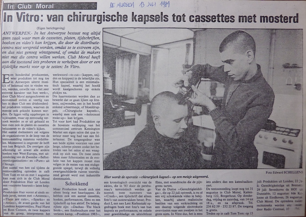 ANTWERPEN.- In het Antwerpse bestaat nog altijd geen zaak waar men de cassettes, platen, tijdschriften, boeken en video's kan krijgen, die door de distributiecentra niet verspreid worden, omdat ze te extreem zijn, en dus niet genoeg winstgevend, of omdat de makers niet met die centra willen werken. Club Moral heeft aan die toestand iets proberen te verhelpen door er een tijdelijke markt voor op te zetten: In Vitro. Een honderdtal producenten, wier produkten tot nog toe in Antwerpen uiterst moeilijk of helemaal niet te vinden waren, werden, omwille van «het zeer extreme karakter van hun werk»›, door Club Moral aangeschreven en momenteel stellen al veertig van hen in deze Club een driehonderdtal produkten tentoon, waarvan de meeste ook gekocht kunnen worden. Ze liggen veilig opgeborgen in kijkkasten, maar op eenvoudig verzoek worden ze er uit gehaald en kan men ook de platen en cassettes beluisteren en de video's kijken. Het aantal deelnemers zal volgens de organizatoren in de loop van de tentoonstelling minstens verdubbelen. Momenteel is ongeveer de helft van hen Belgisch. De overigen zijn afkomstig uit zowat alle andere hoeken van West-Europa, met uitzondering van de Zweedse «Selbstmordorganisation» en «Pure» uit Chicago. Een aantal van hen zal tijdens de tentoonstelling optreden in café Tom Tom en tot en met 1 augustus kan men zich in de Club. Moral door Produktion Hair uit Londen een «extreme haarsnit» laten knippen. Produktion Hair vormt al sinds enkele jaren, samen met «Antenna», «These are cuts», «Sparks» en «Attixs», de avant-garde van het Londens kappersmilieu. Paul Hurst en Ross Cannon, de twee kappers van de groep, interpreteren het werkwoord «<to cut» (kappen, snijden en knippen) in de letterlijke zin. Hun specialiteit is een minimalistisch kapsel, waarbij het hoofd wordt kaalgeschoren op enkele plukjes na. Die haarrestanten worden dan zo bewerkt dat ze gaan lijken op littekens, snijwonden, een in het hoofd stekend scheermesje, of bloeddruppels. «Chirurgische kapsels>, waarbij men ook een «holocaust make-up» kan krijgen. Tot voor kort had Produktion op de bovenste verdieping van het commercieel centrum Kensington Market een eigen salon dat qua interieur meer weg had van een folterkamer. De toegangsdeur was aan beide zijden voorzien van zeer lange, scherpe pinnen zodat het betreden van het salon al een waagstuk op zich was. De twee zetels leken meer folterstoelen en de evolutie van het kappen moest men volgen in de resten van een stukgegooide spiegel, terwijl de volledig zwartgeschilderde ruimte voortdurend gevuld werd met industriële doemmuziek.. Schokkend Maar ProduKtion houdt zich niet alleen bezig met haarkappen. Ze hebben ook een aantal cassettes, boeken, performances, films en een tijdschrift op hun aktief. De belangrijkste zijn: «Dachau - The black book», een fotobrochure over het verlaten kamp; «Prodition 1983», een kronologisch overzicht van de akties, die in '83 door de persbureau's terroristisch werden genoemd; twee nummers van «Crash», een tijdschrift dat alleen foto's van autowrakken bevat; Product I, een aan Leni Riefenstahl opgedragen boek met foto's van hun kapsels en performances; en enkele zeer gewelddadige en uitzichtloze films, met soundtracks die de pijngrens tarten. Van de Duitse «Gerechtigkeidsliga», die op 22 juli optreedt, is nu al een vrij schokkende video te bekijken, waarbij uiterst realistische beelden van een verkrachting en een daarop volgende electrokutie overvloeien naar een zwalpen in het grote niets. In Vitro dus, het is eens iets anders dan een katedraalkoncert. De tentoonstelling loopt nog tot 31 augustus in Club Moral, Kattenberg 122, Borgerhout. Op donderdag, vrijdag en zaterdag, van 14 tot 18 u., en na afspraak. Tel. 236 82 59 - 232 25 87. De toegang is gratis. Treden op in café Tom Tom: op 15 juli: Produktion uit Londen; 22 jali: Gerechtigkeitsliga uit Bremen: 29 juli: Sevenhoms da HO! uit Dunstable; 12 augustus: 6de Kelonne uit Eindhoven; 26 augustus: Club Moral. De optredens zullen rechtstreeks worden uitgezonden door Radio Centraal, 10 FM
