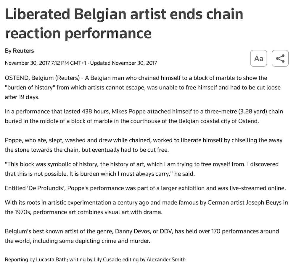 OSTEND, Belgium (Reuters) - A Belgian man who chained himself to a block of marble to show the “burden of history” from which artists cannot escape, was unable to free himself and had to be cut loose after 19 days. In a performance that lasted 438 hours, Mikes Poppe attached himself to a three-meter (3.28 yard) chain buried in the middle of a block of marble in the courthouse of the Belgian coastal city of Ostend. Poppe, who ate, slept, washed and drew while chained, worked to liberate himself by chiseling the away the stone toward the chain, but eventually had to be cut free. “This block was symbolic of history, the history of art, which I am trying to free myself from. I discovered that this is not possible. It is burden which I must always carry,” he said. Entitled ‘De Profundis’, Poppe’s performance was part of a larger exhibition and was live-streamed online. With its roots in artistic experimentation a century ago and made famous by German artist Joseph Beuys in the 1970s, performance art combines visual art with drama. Belgium’s best known artist of the genre, Danny Devos, or DDV, has held over 170 performances around the world, including some depicting crime and murder. Reporting by Lucasta Bath; writing by Lily Cusack; editing by Alexander Smith