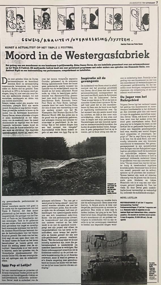 Drie jaar geleden blies de Duitse seriemoordenaar en kannibaal Joachim Kroll na zevenenvijftig inspannende levensjaren zijn laatste adem uit. Achter slot en grendel. Toen de schurk in 1976 in de boeien werd geslagen, hing hij juist met zijn neus boven een zelfbereide stoofpot, vol met worteltjes, aardappels en delen van zijn laatste slachtoffer. Enkele weken nadat zijn moeder was overleden, pleegde Kroll zijn eerste moord. Er zouden er nog dertien volgen. Deze gruwelijke materie is koren op de molen van de Antwerpse kunstenaar Danny Devos, wiens artistieke uitingen al jaren hoofdzakelijk in het teken staan van de zoektocht naar 'de meest shockerende en tegelijk voor de hand liggende verbanden tussen kunst en kwaad, naar de dunne scheidslijn tussen norm en afwijking . Zijn degelijke opzoekingswerk leidde tot, veelal weinig gewaardeerde, performances en exposities. Devos' macabere oeuvre valt goed in de aarde van de organisatoren van het Triple X Festival, dat deze zomer plaatsvindt op het terzein van de Westergastabriek. De opvolger van het Festival of Fools en het Zomertestijn menen sommigen. Toch is dit gebeuren van een ander allooi, want zoals het de door gevoelens van angst en onveiligheid overmande inwoners van het koude, donkere Noord-Europa betaamt, kozen de festivalmakers voor het thema Kunst en geweld. Het credo van het lestival oogt als een open deur: men wil 'de band tussen de kunst en het leven benadrukken' en 'ruimte geven aan kunst die stelling neemt over de actualiteit.' Desondanks is er veel moois te beleven, zoals het optreden van de 'dramatische stemkunstenares' Diamanda Galàs (VS), die een avantgardemis zal opdragen aan de aidsslachtolters. Iggy Pop of Latijn? Tal van voorstellingen en projecten uit diverse disciplines vinden plaats op dit complex van braakliggende vlakten en indrukwekkende industriéle architectuur. Devos' werk is onderdeel van de over het terrein verspreide expositie Corridor, gebaseerd op de eveneens weinig opzienbarende these dat kunst geen geisoleerde positie inneemt ten opzichte van de werkelijkheid, maar de wereld en het leven reflecteert. Naast oude, op video te bezichtigen performances van Abramovic/Ulay, presenteert men werk van Marlene Dumas, Jean-Sylvain Bieth, Armando, Irwin, Paul Perry en Peter Baren. Laatsgenoemde toont het werk Vanitas Poles, dat min of meer een voortzetting is van zijn eerdere project aan het Mr. Visserplein: Text Twisters (Spirits In The Material World) 1990. Zes palen zijn in de grond van de gasfabriek gedreven, met schoepen waarop een Latijnse vanitas-tekst is geschilderd. In de vertaling: Zijn er wel andere dingen dan een kort moment van vreugde?' Aanvankelijk wilde Baren enkele regels uit een tekst van Iggy Pop op de schoepen schilderen - You can get a weird price for being adored' - maar het aantal woorden strookte niet met het aantal ontworpen palen. Aan de andere zijde van de schoepen treft men atbeeldingen van opeenvolgende stadia van een zich innestelend aids-virus. Baren - die ook performances uitvoert, de 'museumkunst' met alle genoegen aan anderen overlaat en het liefst werkt in en met de openbare ruimtepoogt met zijn project niet alleen de vergankelijkheid van het leven te benadrukken, maar tevens het paychische en fysieke geweld dat een met aids-geinfecteerd persoon overkomt. Baren: "Met die Latijnse tekst wil ik niet onnodig mysterieus zijn, maar die geheimzinnigheid is noodzakelijk om meerdere associaties te verkrijgen. Het thema aids suggereert misschien dat ik klakkeloos meedrijf op de politiek correcte kunststroming die nu uit Amerika overwaait, maar ik werd er gewoon in m'n directe omgeving meo gecontronteerd en binnen het kader van het festival zie ik het tonen hiervan als een uitdaging." Inspiratie uit de gevangenis De helderheid van Baren staat in schril contrast met het grondige graafwerk van Devos, die al jaren met een aantal seriemoordenaars correspondeert (zij het nooit met Kroll), zoals de Antwerpse wurger van de linkeroever. Devos: "Deze wurger kwam in '82 uit de bak en moordde vrijwel direct opnieuw. Hij beseft heel goed dat er iets onomkeerbaars bij hem aan de hand is en heeft er regelmatig nachtmerries over. Op het moment van zijn eerste moord was hij achttien, en kijk je dan naar mijn ontwikkeling... allez, ik was even oud toen ik begon met mijn performances. Voorstellingen met een tamelijk agressief en mensonvriendelijk karakter, die buiten de geijkte kaders vielen. Aangezien ik geen gelegenheid had ze op te voeren, gaf ik thuis uiting aan die oncontroleerbare drang en maakte foto's met de zelfontspanner. Geen mens wist hiervan. In Belgie stuitte ik later met dergelijke performances op enorme tegenstand. Men wilde er niets mee te maken hebben, het ging ze te ver. Toch bleet ik het doen. Dergelijke dingen leg ik zo'n moordenaar uit, en probeer vervolgens te achterhalen wat nu zijn reactie is op het onvermogen weerstand te bieden aan bepaalde dingen waaraan je onderhevig bent. Feitelijk is het gedrag van een kunstenaar en dat van een moordenaar (of wetenschappers en religieuzen) gelijkwaardig. En dat beseffen maar weinigen, aangezien kunst algemeen als ontspanning of als interessant wordt ervaren." De Jager van het Ruhrgebied Volgens Devos ligt het verband tussen het gedrag van kunstenaars en moordenaars hoofdzakelijk in het driftmatige. Zijn interesse gaat dan ook vooral uit naar de zogeheten motiefloze moorden. Devos: "Allez, ook kunst is motiefloos, want voor het maken ervan bestaat geen aanwijsbare reden. Kroll ging erg ver in hetgeen hij deed, en dat bewijst dat er gedurende bepaalde perioden een bepaalde geestesgesteldheid was, waarbij een aantal dingen werd uitgesloten of overstegen, begrijpt u?" Het is, zegt Devos nog volop in de ban van de zaak Kroll, niet eenvoudig informatie over zijn favoriete moordenaar te verzamelen. Het gevangenispersoneel is een spreekverbod over de Jager van het Ruhrgebied opgelegd en ook elders wordt de kunstenaar 'om onduidelijke redenen tegengewerkt'