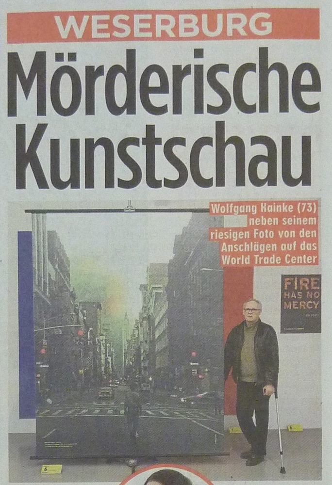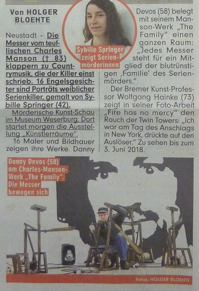 Bremen – Die Messer vom teuflischen Charles Manson († 83) klappern zu Countrymusik, die der Killer einst schrieb. 16 Engelsgesichter sind Porträts weiblicher Serienkiller, gemalt von Sybille Springer (42). Mörderische Kunst-Schau im Museum Weserburg. Dort startet Freitag die Ausstellung „Künstlerräume". 16 Maler und Bildhauer zeigen ihre Werke. Danny Devos (58) belegt mit seinem Manson-Werk „The Family" einen ganzen Raum: „Jedes Messer steht für ein Mitglied der blutrünstigen ,Familie' des Serienmörders." Der Bremer Kunst-Professor Wolfgang Hainke (73) zeigt in seiner Foto-Arbeit „Fire has no mercy" den Rauch der Twin-Towers: „Ich war am Tag des Anschlags in New York, drückte auf den Auslöser." Zu sehen bis zum 3. Juni 2018.