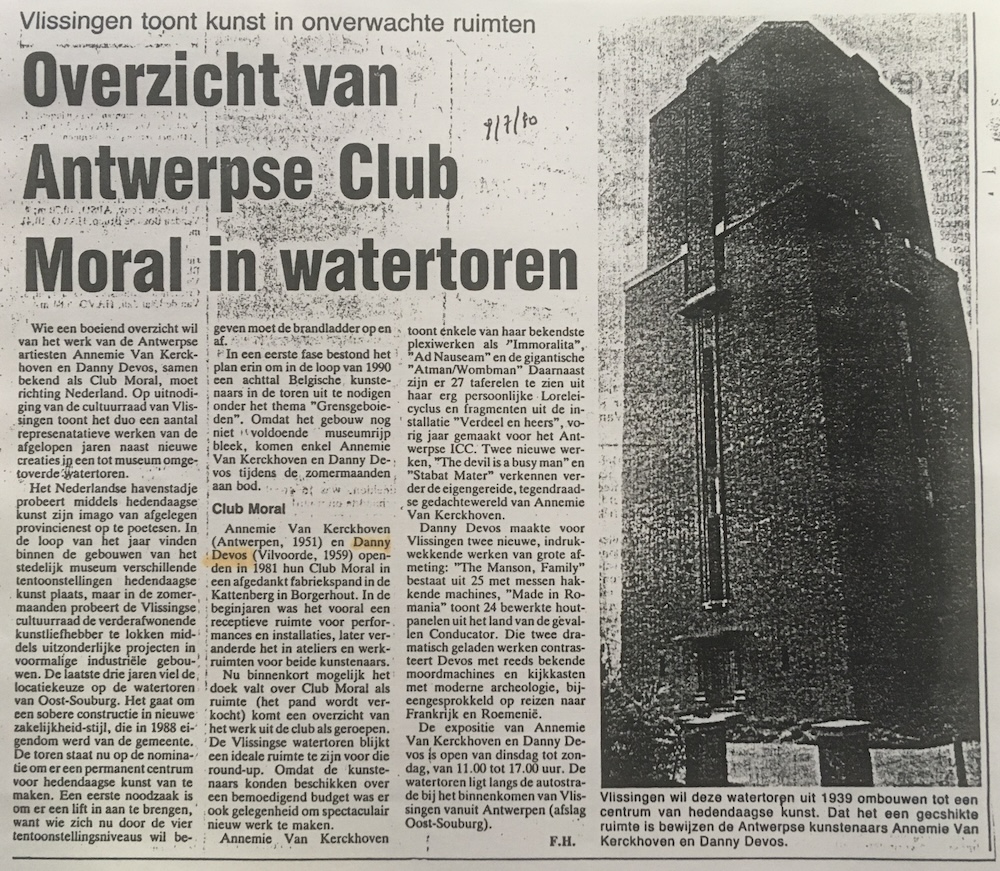 'Wie een boeiend overzicht wil van het werk van de Antwerpse artiesten Annemie Van Kerckhoven en Danny Devos, samen bekend als Club Moral, moet richting Nederland. Op uitnodiging van de cultuurraad van Vlissingen toont het duo een aantal represenatatieve werken van de afgelopen jaren naast nieuwe creaties in een tot museum omgetoverde watertoren. Het Nederlandse havenstadje probeert middels hedendaagse kunst zijn imago van afgelegen provincienest op te poetesen. In de loop van het jaar vinden binnen de gebouwen van het stedelijk museum verschillende tentoonstellingen hedendaagse kunst plaats, maar in de zomermaanden probeert de Vlissingse, cultuurraad de verderafwonende kunstliefhebber te lokken middels uitzonderlijke projecten in voormalige industriële gebouwen. De laatste drie jaren viel de locatiekeuze op de watertoren van Oost-Souburg. Het gaat om een sobere constructie in nieuwe zakelijkheid-stijl, die in 1988 eigendom werd van de gemeente. De toren staat nu op de nominatie om er een permanent centrum voor hedendaagse kunst van te maken. Een eerste noodzaak is om er een lift in aan te brengen, want wie zich nu door de vier tentoonstellingsniveaus wil begeven moet de brandladder op en af. In een eerste fase bestond het plan erin om in de loop van 1990 een achttal Belgische kunstenaars in de toren uit te nodigen onder het thema "Grensgebieden". Omdat het gebouw nog niet voldoende museumrijp bleek, komen enkel Annemie Van Kerckhoven en Danny Devos tijdens de zomermaanden aan bod. Club Moral Annemie Van Kerckhoven (Antwerpen, 1951) en Danny Devos (Vilvoorde, 1959) openden in 1981 hun Club Moral in een afgedankt fabriekspand in de Kattenberg in Borgerhout. In de beginjaren was het vooral een receptieve ruimte voor performances en installaties, later veranderde het in ateliers en werkruimten voor beide kunstenaars. Nu binnenkort mogelijk het: doek valt over Club Moral als ruimte (het pand wordt verkocht) komt een overzicht van het werk uit de club als geroepen. 'De Vlissingse watertoren blijkt een ideale ruimte te zijn voor die round-up. Omdat de kunstenaars konden beschikken over een bemoedigend budget was er ook gelegenheid om spectaculair nieuw werk te maken. Annemie, Van Kerckhoven •toont enkele van haar bekendste plexiwerken als "Immoralita" "Ad Nauseam" en de gigantische "Atman/Wombman" Daarnaast zijn er 27 taferelen te zien uit haar erg persoonlijke Loreleicyclus en fragmenten uit de installatie "Verdeel en heers" , vorig jaar gemaakt voor het Antwerpse ICC. Twee nieuwe werken, "The devil is a busy man" en "Stabat Mater" verkennen verder de eigengereide, tegendraadse gedachtewereld van Annemie Van Kerckhoven. Danny Devos maakte voor Vlissingen twee nieuwe, indrukwekkende werken van grote afmeting: "The Manson Family" bestaat uit 25 met messen hakkende machines, "Made in Romania" toont 24 bewerkte houtpanelen uit het land van de gevallen Conducator. Die twee dramatisch geladen werken contrasteert Devos met reeds bekende moordmachines en kijkkasten met moderne archeologie, bijeengesprokkeld op reizen naar Frankrijk en Roemenië. De expositie van Annemie Van Kerckhoven en Danny Devos is open van dinsdag tot zondag, van 11.00 tot 17.00 uur. De watertoren ligt langs de autostrade bij het binnenkomen van Vlissingen vanuit Antwerpen (afslag Oost-Souburg).