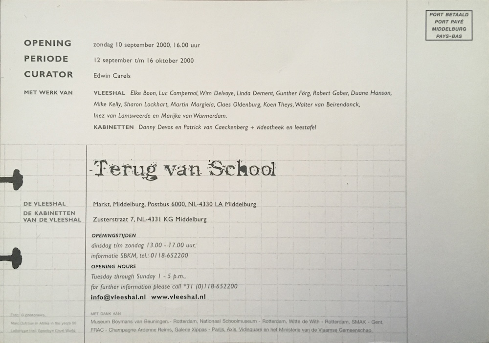 Sunday 10th of September 2000 -> Monday 16th of October 2000 in De Kabinetten van de Vleeshal, Zusterstraat 7, Middelburg, Netherlands. weblink | ||