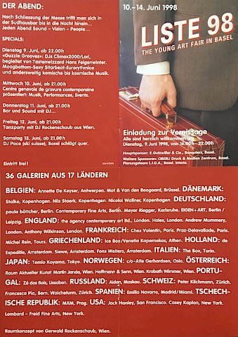 Tuesday 9th of June 1998 -> Sunday 14th of June 1998 in The Young Art Fair in Basel, Burgweg 15, Basel, Switzerland. | ||