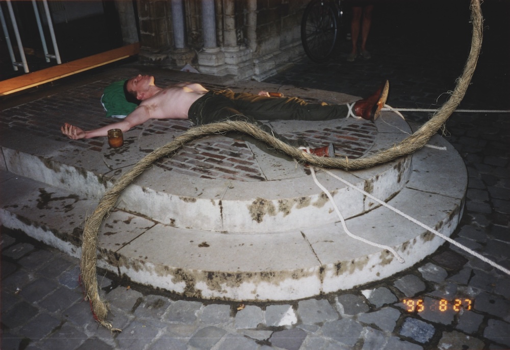 Het publiek ging de ruimte binnen door een glazen deur. Daarna maakte ik een dun touw vast aan de buitenkant van de deur ging op de grond liggen en bond mijn voeten vast aan twee palen op het voetpad. Het andere eind van het touw slikte ik in. De performance stopte toen iemand de deur van binnenuit opende. The audience entered the space through a glass door. Then I tied a thin rope to the outside of the door lay down on the ground and tied my feet to two posts on the street. The other end of the rope I swallowed. The performance stopped when someone opened the door from the inside. | ||