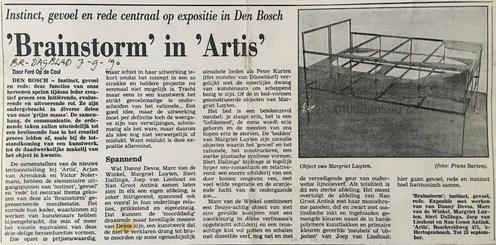 DEN BOSCH - Instinct, gevoel en rede: deze functies van onze hersenen spelen tijdens ieder creatief proces een initiérende, evoluerende en uitvoerende rol. Ze zijn ondergebracht in diverse delen van onze 'grijze massa'. De samenhang, de communicatie, de ordenende taken zullen uiteindelijk tot een beslissende fase in het creatief proces leiden of, zoals bij de totstandkoming van een kunstwerk, tot de daadwerkelijke makelij van het object in kwestie. De samenstellers van de nieuwe tentoonstelling bij 'Artis', Arjan van Arendonk en Victor Notermans, hebben de elementaire uitgangspunten van 'instinct', 'gevoel' en 'rede' tot centraal thema gekozen van deze als 'Brainstorm' gepresenteerde manifestatie. Het vormde hun kader, waarbinnen zij werken van kunstenaars hebben bijeengebracht, die min of meer het visuele equivalent van deze drie-delige hersenfuncties vormen. Die opzet is prijzenswaardig, maar schiet in haar uitwerking tekort omdat het concept in een 20 strakke en heldere projectie nu eenmaal niet mogelijk is. Tracht maar eens in een kunstwerk het strikt gevoelsmatige te onderscheiden van het rationele... Een goed idee, maar de uitwerking moet per definitie toch de weergave zijn van verwijzingen, schetsmatig als het ware, maar daarom als idee nog niet verwerpelijk of mislukt. Want mislukt is deze expositie allerminst. Spannend Wat Danny Devos, Marc van de Winkel, Margriet Luyten, Siert Dallinga, Joep van Lieshout en Nan Groot Antink samen laten zien in elk een eigen afdeling, is zeker intrigerend, spannend ook en vooral in hun onderlinge relaties, prikkelend en eigenzinnig. Dat kunnen de 'moorddadig' draaiende maar beveiligde messen van Devos zijn, een kunstwerk dat de niet te verklaren drang tot brute moorden op soms ogenschijnlijk aimabele lieden als Peter Kurten (Het monster van Düsseldorf) vergelijkt met de innerlijke dwang van kunstenaars om scheppend bezig te zijn. Of de in bed-vormen geconstrueerde objecten van Margriet Luyten. Het bed is een betekenisvol meubel: je slaapt erin, het is een 'liefdesnest', de mens wordt erin geboren en de meesten van ons hopen erin te sterven. De 'bedden' van Margriet Luyten zijn zinvolle objecten waarin het 'gevoel' en het rationele, het constructieve, een sterke plastische synthese vormen. Siert Dallings' bijdrage is tegelijk hyper neo-romantisch en relativerend: een enorm schilderij van een door bossen omgeven ven, met veel wilde vegetatie en de oranjerode lucht van de ondergaande zon... Marc van de Winkel combineert een Beuys-achtig object van met stro gevulde konijnen met een roestkleurig in dikke verfmassa's opgebracht schilderij en een reusachtige kist vol potten en schalen met diezelfde verf, nog nat en met de verzadigende geur van ouderwetse lijnolieverf. Als totaliteit is dit een sterke afdeling. Het meest overtuigt de afdeling van Nan Groot Antink met haar monochrome panelen, dof en zwart met oostindische inkt en ingehouden gemengde kleuren naast de in harde polymere kunstlakken en primaire kleuren geverfde 'meubels' of 'objecten' van Joep van Lieshout: hier gaan gevoel, rede en instinct heel harmonisch samen.