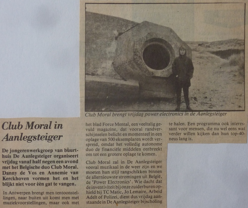 De jongerenwerkgroep van buurthuis De Aanlegsteiger organiseert vrijdag vanaf half negen een avond met het Belgische duo Club Moral. Danny de Vos en Annemie van Kerckhoven vormen het en het blijkt niet voor één gat te vangen. In Antwerpen brengt men tentoonstellingen, naar buiten uit komt men met muziekvoorstellingen, maar ook met het blad Force Mental, een veeltalig gevuld magazine, dat vooral randverschijnselen belicht en momenteel in een oplage van 500 eksemplaren wordt verspreid, omdat het volledig autonome duo de financiële middelen ontbreekt om tot een grotere oplage te komen. Club Moral zal in De Aanlegsteiger vooral muzikaal in de weer zijn en we moeten hun stijl rangschikken binnen de allernieuwste stromingen uit België, de 'Power Electronics'. Wie dacht dat de inventiviteit bij onze zuiderburen ophield bij TC Matic, Jo Lemaire, Arbeid Adelt of Polizei, dient dus vrijdag aanstaande in De Aanlegsteiger bijscholing te halen. Een programma ook interessant voor mensen, die nu wel eens wat verder willen kijken dan hun top-40neus lang is.