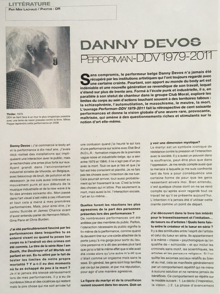Sans compromis, le performeur belge Danny Devos n'a jamais été recupéré par les institutions artistiques qui l'ont toujours regarde avec une certaine crainte. Pourtant, son apport au monde du body art est indéniable et une nouvelle génération se revendique de son travail, lequel s'étend sur plus de trente ans. Formé à l'école punk et industrielle, il a, en parallèle à son statut de chanteur dans le groupe Club Moral, explore les limites du corps au sein d'actions touchant souvent à des territoires tabous : la schizophrénie, l'automutilation, le masochisme, le meutre, la mort. L'ouvrage Performan-DDV 1979-2011 fait la rétrospective de cent soixante performances et donne la vision globale d'une œuvre rare, provocante, maitrisée, qui amène à des questionnements riches et stimulants sur la notion d'art elle-même.