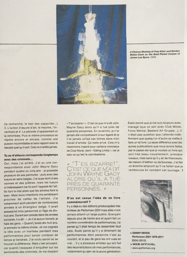 D'où est venue l'idée de ce livre commémoratif ? Il y a déjà eu des éditions photocopiées très limitées de Performan-DDV mais elles n'ont jamais atteint un large public. Exerçant depuis plus de trente ans et ayant fait un nombre considérable de performances. j'ai pensé qu'il était temps de rassembler tout cela. Aussi parce qu'il y a tellement de performances dont personne n'est au courant, et si peu de gens les ont vues en vrai... Il y a plusieurs artistes qui ont fait des reconstitutions de mes performances, notamment au sein de la jeune génération. Etant donné que je me suis toujours automanagé (que ce soit avec Club Moral, Force Mental, Bastard Art Gruppe...). il n'était pas question que j'attende indéfiniment que quelqu'un d'autre se mette à faire un tel livre. La seule différence avec les autres publications que nous avons faites par le passé est que je voulais un livre qui soit très beau visuellement, presque luxueux, mais sans qu'il y ait de financeurs, de maison d'édition ou de bourses. J'ai fait un énorme emprunt qu'il va falloir que je rembourse en vendant cet ouvrage.