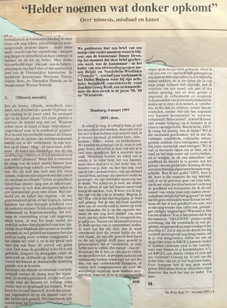 (Brief aan Danny Devos) anonymous in De Witte Raaf, Monday 1st May 1995, Belgium. | |