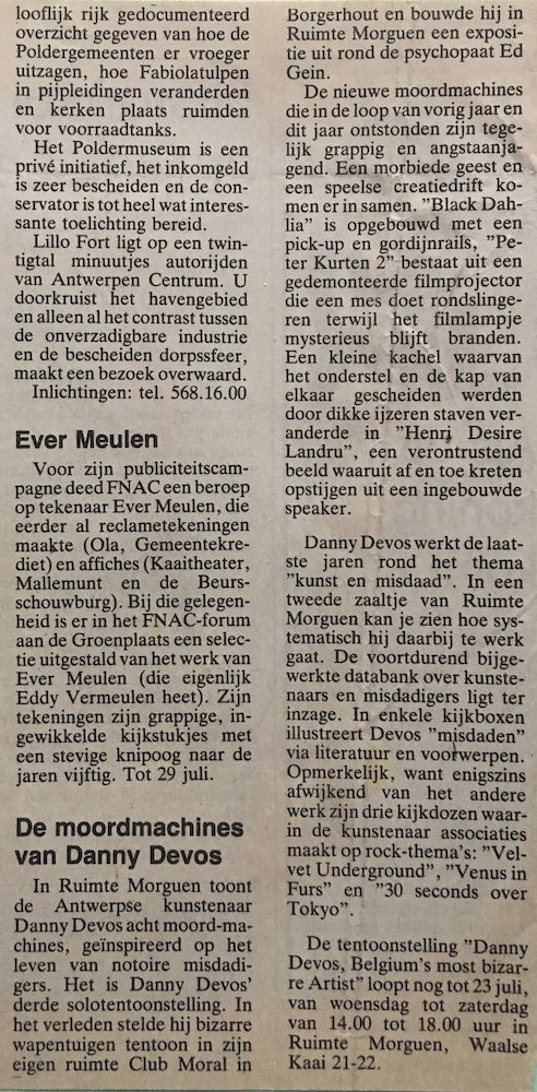 In Ruimte Morguen toont de Antwerpse kunstenaar Danny Devos acht moord-machines, geinspireerd op het leven van notoire misdadigers. Het is Danny Devos' derde solotentoonstelling. In het verleden stelde hij bizarre wapentuigen tentoon in zijn eigen ruimte Club Moral in Borgerhout en bouwde hij in Ruimte Morguen een expositie uit rond de psychopaat Ed Gein. De nieuwe moordmachines die in de loop van vorig jaar en dit jaar ontstonden zijn tegelijk grappig en angstaanjagend. Een morbiede geest en een speelse creatiedrift komen er in samen. "Black Dahlia" is opgebouwd met een pick-up en gordijnrails, "Peter Kurten 2" bestaat uit een gedemonteerde filmprojector die een mes doet rondslingeren terwijl het filmlampje mysterieus blijft branden. Een kleine kachel waarvan het onderstel en de kap van elkaar gescheiden werden door dikke ijzeren staven veranderde in "Henri Desire Landru" , een verontrustend beeld waaruit af en toe kreten opstijgen uit een ingebouwde speaker. Danny Devos werkt de laatste jaren rond het thema "kunst en misdaad" '. In een tweede zaaltje van Ruimte Morguen kan je zien hoe systematisch hij daarbij te werk gaat. De voortdurend bijgewerkte databank over kunstenaars en misdadigers ligt ter inzage. In enkele kijkboxen illustreert Devos "misdaden" via literatuur en voorwerpen. Opmerkelijk, want enigszins afwijkend van het andere werk zijn drie kijkdozen waarin de kunstenaar associaties maakt op rock-thema's: "Velvet Underground", "Venus in Furs" en "30 seconds over Tokyo" De tentoonstelling "Danny Devos, Belgium's most bizarre Artist" loopt nog tot 23 juli, van woensdag tot zaterdag van 14.00 tot 18.00 uur in Ruimte Morguen, Waalse Kaai 21-22.