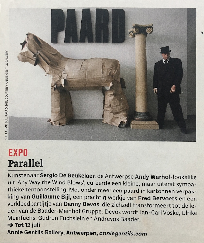 Kunstenaar Sergio De Beukelaer, de Antwerpse Andy Warhol-lookalike uit 'Any Way the Wind Blows', cureerde een kleine, maar uiterst sympathieke tentoonstelling. Met onder meer een paard in kartonnen verpakking van Guillaume Bijl, een prachtig werkje van Fred Bervoets en een verkleedpartijtje van Danny Devos, die zichzelf transformeert tot de leden van de Baader-Meinhof Gruppe: Devos wordt Jan-Carl Voske, Ulrike Meinfuchs, Gudrun Fuchslein en AndreVos Baader.