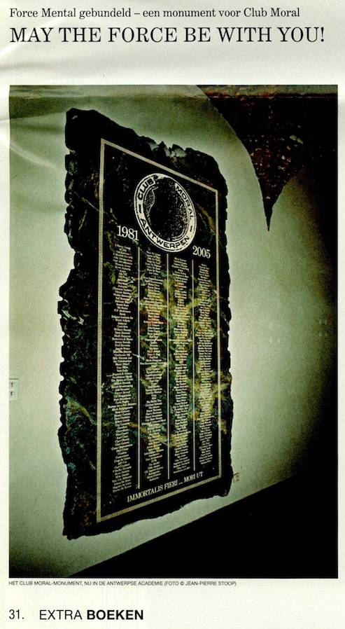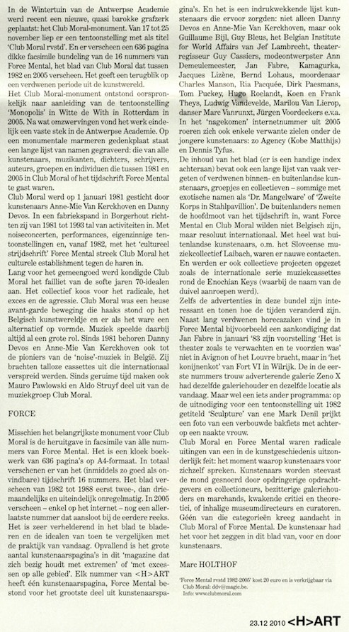 Force Mental gebundeld - een monument voor Club Moral MAY THE FORCE BE WITH YOU!In de Wintertuin van de Antwerpse Academie werd recent een nieuwe, quasi barokke grafzerk geplaatst: het Club Moral-monument. Van 17 tot 25 november liep er een tentoonstelling met als titel 'Club Moral rvstd'. En er verscheen een 636 pagina dikke facsimile bundeling van de 16 nummers van Force Mental, het blad van Club Moral dat tussen 1982 en 2005 verscheen. Het geeft een terugblik op een verdwenen periode uit de kunstwereld. Het Club Moral-monument ontstond oorspronkelijk naar aanleiding van de tentoonstelling 'Monopolis' in Witte de With in Rotterdam in 2005. Na wat omzwervingen vond het werk eindelijk een vaste stek in de Antwerpse Academie. Op een monumentale marmeren gedenkplaat staat een lange lijst van namen gegraveerd: die van alle kunstenaars, muzikanten, dichters, schrijvers, auteurs, groepen en individuen die tussen 1981 en 2005 in Club Moral of het tijdschrift Force Mental te gast waren. FORCE Misschien het belangrijkste monument voor Club Moral is de heruitgave in facsimile van alle nummers van Force Mental. Het is een kloek boekwerk van 636 pagina's op A4-formaat. In totaal verschenen er van het (inmiddels zo goed als onvindbare) tijdschrift 16 nummers. Het blad verscheen van 1982 tot 1988 eerst twee-, dan driemaandelijks en uiteindelijk onregelmatig. In 2005 verscheen - enkel op het internet - nog een allerlaatste nummer dat aansloot bij de eerdere reeks. Het is zeer verhelderend in het blad te bladeren en de idealen van toen te vergelijken met de praktijk van vandaag. Opvallend is het grote aantal kunstenaarspagina's in dit 'magazine dat zich bezig houdt met extremen' of 'met excessen op alle gebied'. Elk nummer van <H>ART heeft één kunstenaarspagina, Force Mental bestond voor het grootste deel uit kunstenaarspagina's. En het is een indrukwekkende lijst kunstenaars die ervoor zorgden: niet alleen Danny Devos en Anne-Mie Van Kerckhoven, maar ook Guillaume Bijl, Guy Bleus, het Belgian Institute for World Affairs van Jef Lambrecht, theaterregisseur Guy Cassiers, modeontwerpster Ann Demeulemeester, Jan Fabre, Kamagurka, Jacques Lizène, Bernd Lohaus, moordenaar Charles Manson, Ria Pacquée, Dirk Paesmans, Tom Puckey, Hugo Roelandt, Koen en Frank Theys, Ludwig Vandevelde, Marilou Van Lierop, danser Marc Vanrunxt, Jürgen Voordeckers e.v.a. In het 'nagekomen' internetnummer uit 2005 roeren zich ook enkele verwante zielen onder de jongere kunstenaars: zo Agency (Kobe Matthijs) en Dennis Tyfus. Marc HOLTHOF